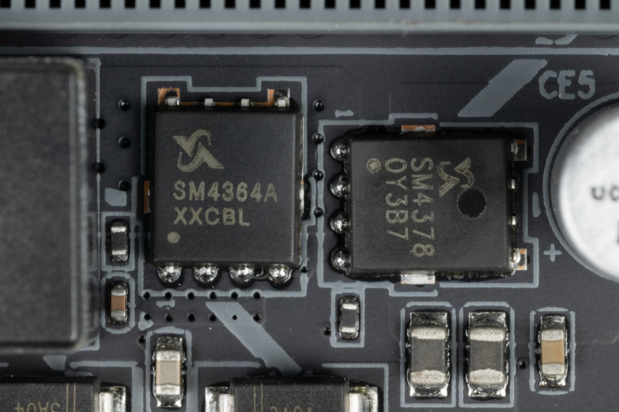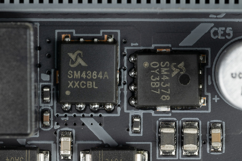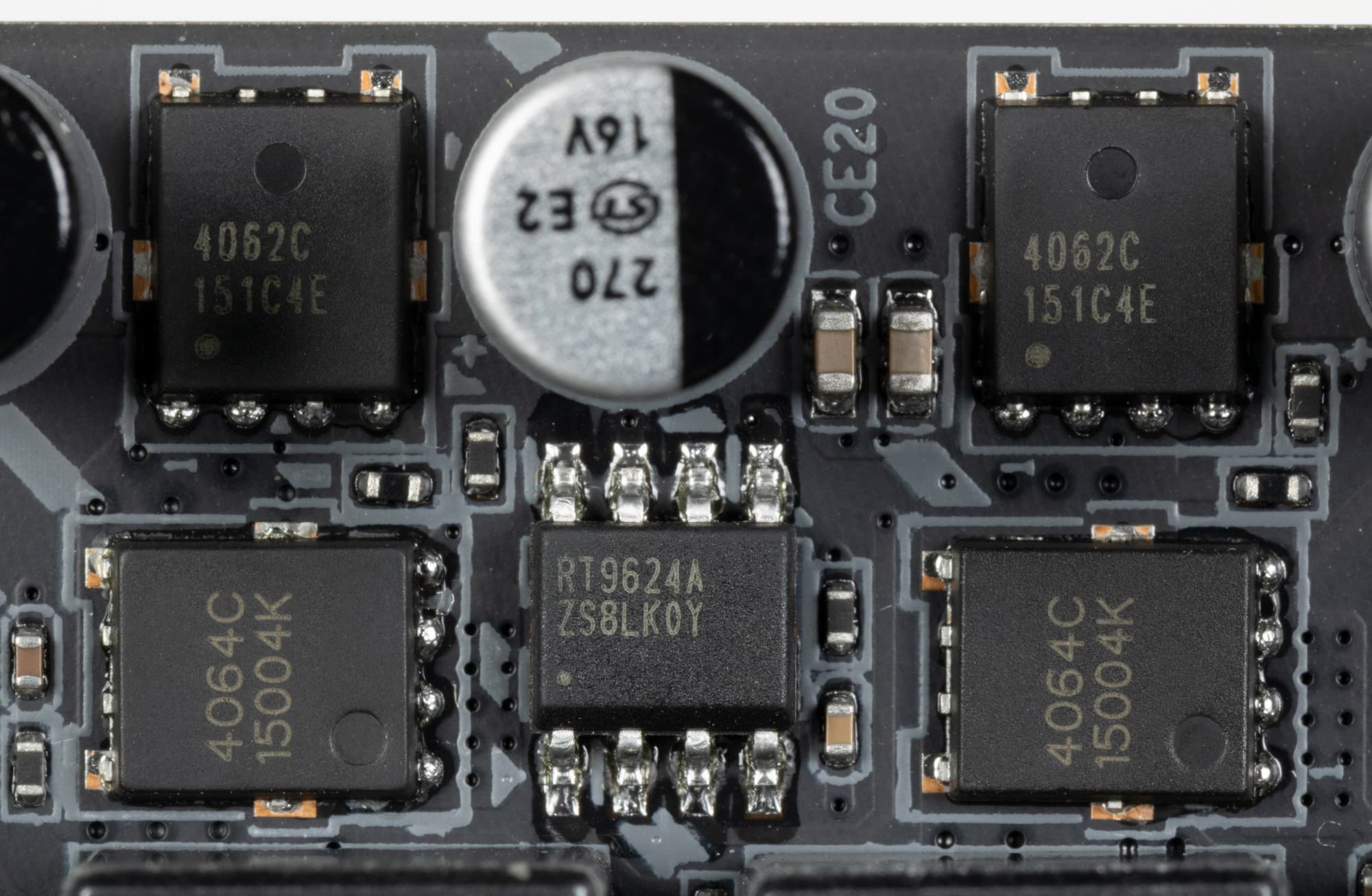 Каждый канал фазы имеет суперферритовый дроссель и набор полевых транзисторов Vishay SIRA14DP/SIRA12DP (20 А).