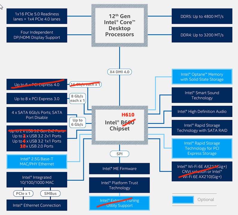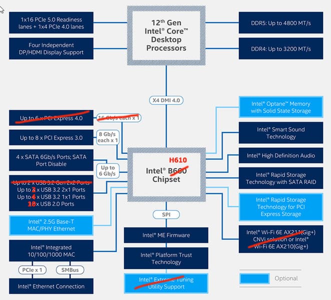 Процессоры Intel Core 12-го поколения (совместимые с сокетом LGA1700 и поддерживаемые H610/B660/Z690) имеют 20 линий ввода-вывода (16 PCIe 5.0, 4 PCIe 4.0), не имеют USB и SATA портов. При этом взаимодействие с H610 идет по особому каналу Digital Media Interface 4.0 (DMI 4.0 x4 (именно х4!)). Все PCIe линии процессора идут на слоты расширения PCIe и порт М.2. Serial Peripheral Interface (SPI) используется для взаимодействия с системой UEFI/BIOS, а шина Low Pin Count (LPC) — для связи с устройствами ввода/вывода, не требующими высокой пропускной способности (контроллерами вентиляторов, TPM, старой периферии).