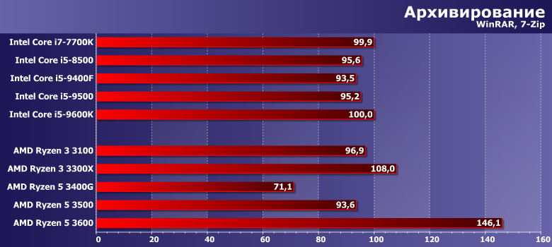 В очередной раз не удивляемся результатам Ryzen 5 3600 — это процессор более высокого класса, нежели прочие испытуемые. Подобные модели совсем недавно Intel продавала под маркой Core i7 и такими будут новые Core i5 — но текущим i5, равно как и «очень старым» i7 от этого не легче. Также без комментариев оставляем результаты Ryzen 5 3400G — вот так, к сожалению, оно все и работало с год назад всего. Зато безусловно на своем месте новые Ryzen 3 — которые сумели обогнать даже Ryzen 5 3500. Не в первый раз уже — почему мы выше и сказали, что эта пара моделей компании нужна была фактически лишь как временное решение. Впрочем, себестоимость его сопоставима с 3100 скорее всего, да и может быть более низкой, чем у 3300X — так что вероятность «глобальной легализации» 3500/3500X существует. Но если этого не произойдет — расстраиваться смысла нет. Да и гоняться за такими моделями, в общем-то, обычно уже тоже.