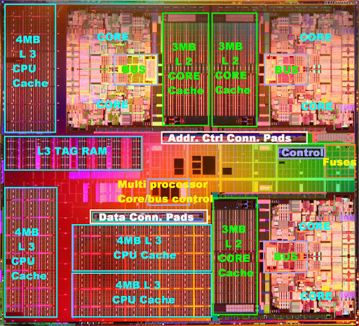А вот технические итоги были другими. Главный — на двух ядрах индустрия не остановилась, поскольку в том же 2006 году появились не только Core 2 Duo, но и склейка из двух таких кристаллов в виде Core 2 Quad. Склейка — плохо? Как массовое решение — в какой-то степени да. Как нишевое — нормально. Программисты еще не разобрались до конца, что делать с двумя ядрами, а для тех, кто разобрался, уже были готовы четыре. В 2008 году и вовсе начали бродить слухи о «Core 2 Hex», то есть шестиядерном процессоре, составленном из трех Core 2 Duo для LGA775. Таких моделей мы не увидели, поскольку их время не пришло, зато шестиядерные Xeon в конце 2008 года появились. Так что после 27 лет принципиальной одноядерности потребовалось всего три-четыре года на внедрение двух, четырех и даже шести ядер! Это не просто большой скачок, а принципиальное изменение рынка.
