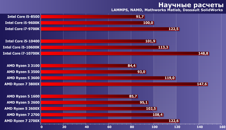 Еще один похожий случай — но со своими нюансами. Много копий сломано на тему того, что чиплетная конструкция новых процессоров AMD вредна в задачах такого рода, поскольку контроллер памяти становится внешним для ядер — однако, верно, это лишь при сравнении с Core. Да и то — на момент выхода не мешало, поскольку для конкуренции с «девятым» поколением запасов прочей дури хватало. А главное — старые Ryzen в этом плане еще хуже. Поэтому мы опять видим, как бюджетный 3100 напрямую борется с шестиядерными Ryzen 5, а «полноценный» 3600 вдребезги и пополам разносит всю старую линейку.