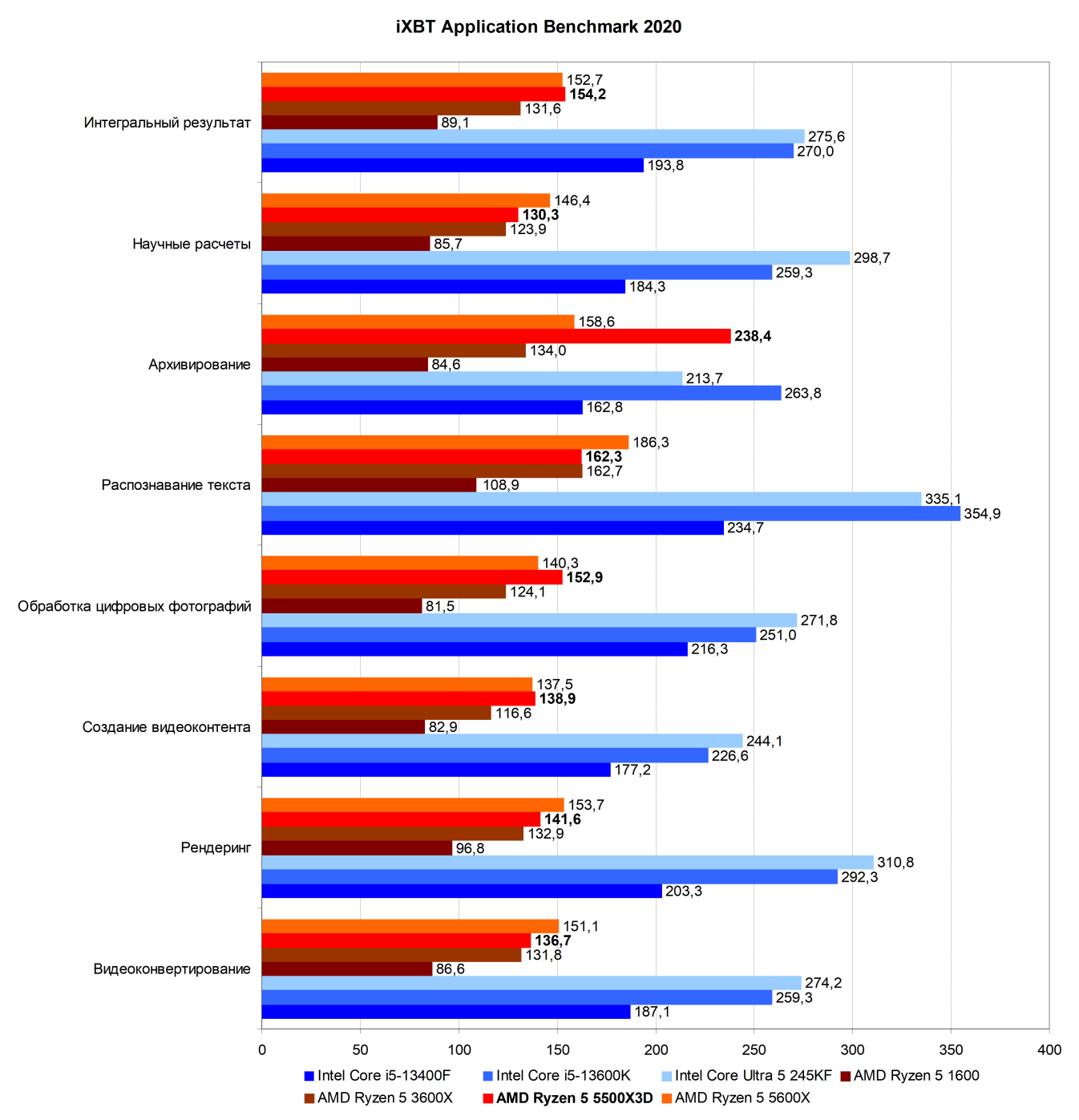 А вот если говорить о конкуренции с более новыми моделями той же Intel, то всё не так хорошо, и это еще мягко говоря. Модель Core Ultra 5 245KF является очень условным конкурентом для 5500X3D, но она заметно быстрее везде, кроме архивирования небольших объемов данных. Конечно, Core Ultra 5 помогает применение более дорогой и быстрой памяти, но по нашим предыдущим тестам тут куда важнее количество вычислительных ядер и их частота, а с этим у бюджетного игрового Ryzen 5 всё плохо. Даже если сравнивать новинку с процессором Core i5-13400F, который заметно дешевле, последний даже в среднем более чем на четверть быстрее 5500X3D в неигровом ПО, а в некоторых разделах разница достигает и 40% (рендеринг и распознавание текста, например). А еще один конкурент в виде Core i5-13600K с близкой ценой так вообще разбивает 5500X3D в пух и прах в неигровом ПО, так как на 75% быстрее в среднем и более чем вдвое производительнее в наиболее требовательных к вычислительной мощности задачах.