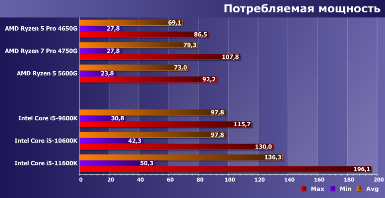 В таких условиях в первую очередь приходится обращать внимание на другие параметры. Например, цены. Или запредельное (для данного сегмента) энергопотребление Rocket Lake. Или существенно более мощную графику в APU — на уровне младших дискретных видеокарт, что, в общем-то, позволяет поиграть во многие игры. Хотя для кого-то может оказаться важнее бо́льшая функциональность платформ Intel — например, поддержка PCIe 4.0 (у AMD по-прежнему нужно выбирать между интегрированной графикой и новым интерфейсом — вместе они не живут) или USB3 Gen2×2. В целом же, как нам кажется, по совокупности характеристик на данный момент в качестве платформы для домашнего неигрового (но с возможностью запуска некоторых игр) компьютера AMD AM4 выглядит намного лучше, чем Intel LGA1200. В случае последней использование интегрированной графики — это, скорее, временная мера: когда планируется игровая система, но пока нет денег на игровую видеокарту. А APU — сбалансированное решение «все в одном»: быстро, недорого, экономично.