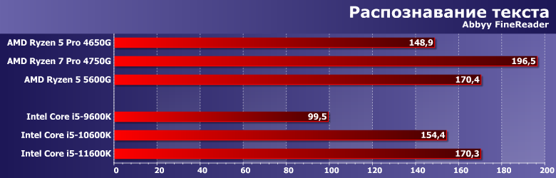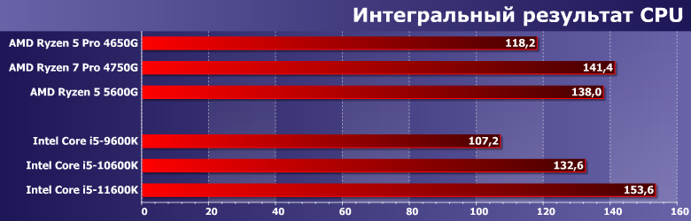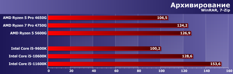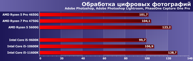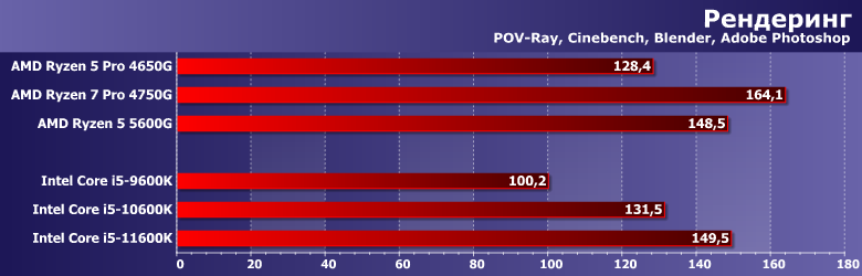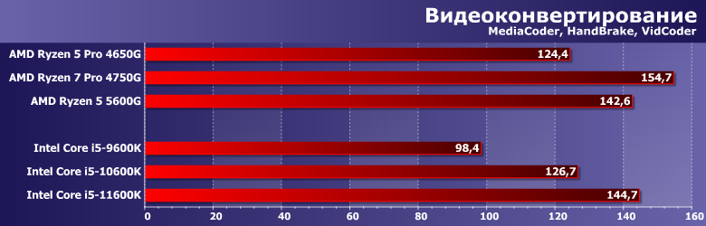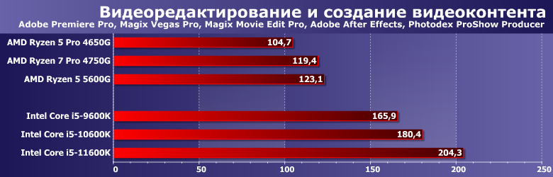 А вот после 2017 года пришлось возвращаться к оригинальному подходу. В той мере, в которой он был возможен, конечно — компактные и/или портативные системы гибко конфигурировать не получается, так что приходится использовать as is. Но уже с поправкой на GPU — который постепенно начали задействовать многие программы, перекладывая на него часть работы с процессора. Впрочем, как показало наше прошлогоднее тестирование AMD Ryzen 5 3400G и Intel Core i5-9600K с интегрированной графикой и двумя дискретными видеокартами особых сложностей это не составляет: большинству программ тестовой методики конкретная модель видеокарты не важна: либо не используется вовсе, либо используется одинаковым образом. Существенно по-разному работают только Adobe Premiere Pro и Magix Movie Edit Pro: используемые нами версии уже умеют задействовать GPU Intel, но еще игнорируют все остальные решения. Сейчас ситуация постепенно меняется, но как и на сколько — будем выяснять уже в рамках новой методики тестирования, которая в скором времени будет готова. Пока же этот момент нужно просто учитывать, но к теме есть смысл вернуться еще раз, благо обе компании обновили свои процессоры. У Intel это первое изменение микроархитектуры за пять лет, а AMD в прошлом году увеличила количество ядер в APU с четырех до восьми — а в этом тоже перевела их на новую микроархитектуру. Понятно, что «чистые» процессоры компании могут иметь большее количество ядер — а при равном стоят дешевле, сохраняя преимущество в количестве кэш-памяти, поддержке PCIe 4.0 и т. п. У Intel же другая проблема — графика есть везде (просто в части процессоров заблокирована — но без изменения прочих характеристик), однако производительность ее, мягко говоря, оставляет желать лучшего. А в моделях до прошлого года та же проблема касалась даже функциональности. Казалось бы, выбор очевиден: если есть возможность поставить видеокарту, так и нужно это сделать. Даже если к ней серьезных требований нет — хотя бы недорогую. Но именно, что «казалось» — поскольку недорогих на современном рынке практически нет. Есть, разве что, давно не обновляемые бюджетные «затычки» — которые по некоторым параметрам еще хуже интеграшек (даже интеловских) — но в современных условиях стоят практически как настоящие. И в таких условиях ориентация на интегрированную графику (хотя бы на время — чтоб дождаться нормализации цен) вполне оправдана. А тут как раз к нам пришел новый Ryzen 5 5600G, который (в отличие от предыдущего поколения APU) компания планирует активно продавать и в розницу — так что решено было начать работу с ним именно с такого материала. Для которого потребовалось протестировать еще несколько процессоров AMD и Intel, но все равно давно собирались это сделать.