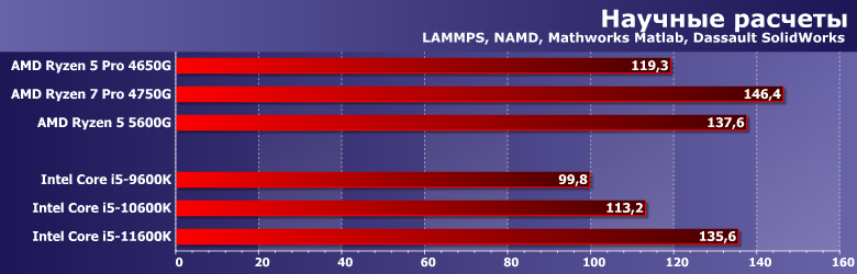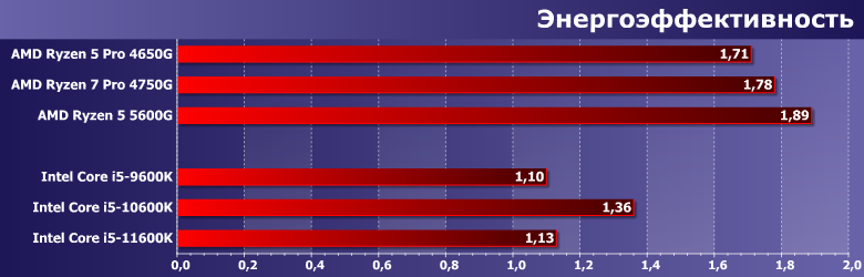Задача в первую очередь на вычисления, причем многопоточные вычисления — поэтому важно количество ядер и потоков. Можем увеличить их количество? Это эффективнее, чем улучшение качества ядер. Поэтому лидером остается 4750G (ибо тут он единственный с формулой 8C/16T), а процессорам Intel больше дало возвращение Hyper-Threading, нежели глубокая модернизация. Но в целом последняя хорошо заметна у обоих компаний — и эффективность практически одинаковая. Да и производительность того же уровня: если 4600G/4650G были непосредственными конкурентами Core i5-10600K, то 5600G уже идет ноздря в ноздрю с i5-11600K.