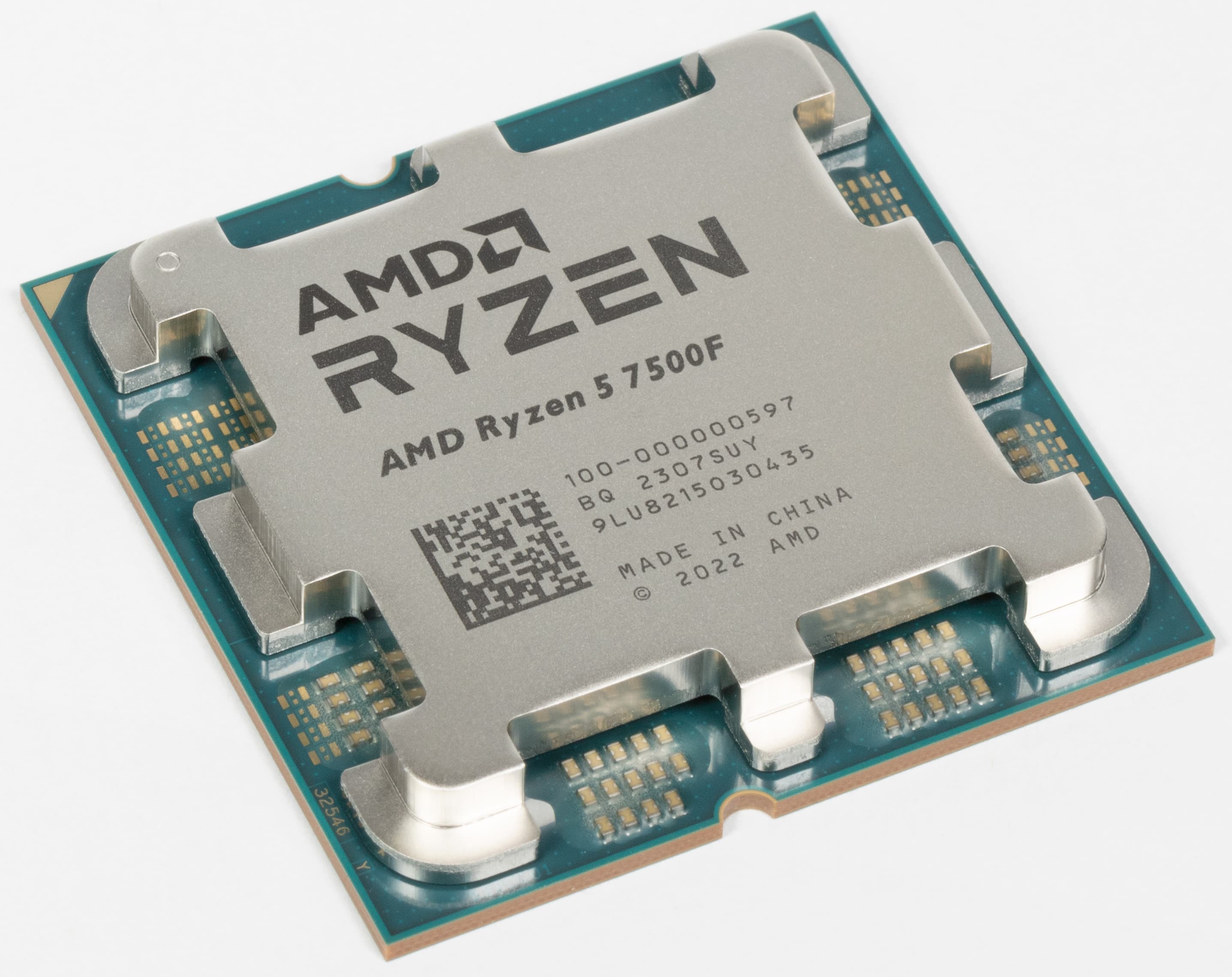 Рынку потребовалась еще более дешевая модель нового семейства, и Ryzen 5 7500F при небольшом снижении частоты и с отключенной встроенной графикой может предложить самый дешевый вариант для того, чтобы опробовать Socket AM5. Сейчас он является самым доступным процессором компании AMD на базе архитектуры Zen 4, и изначально был выпущен только для китайского рынка, и лишь затем появился в розничных магазинах США и Европы, хотя и не настолько массово, как более мощные модели. Судя по наименованию Ryzen 5 7500F и главному отличию от модели 7600 в виде отключенного графического ядра, компания AMD переняла подход к наименованиям у решений Intel, в которых суффикс F означает отсутствие встроенного GPU. Но всё же с небольшим изменением — Ryzen 5 7600 без видеоядра назвали не 7600F, а 7500F, так как базовая и турбочастоты были снижены на 100 МГц.