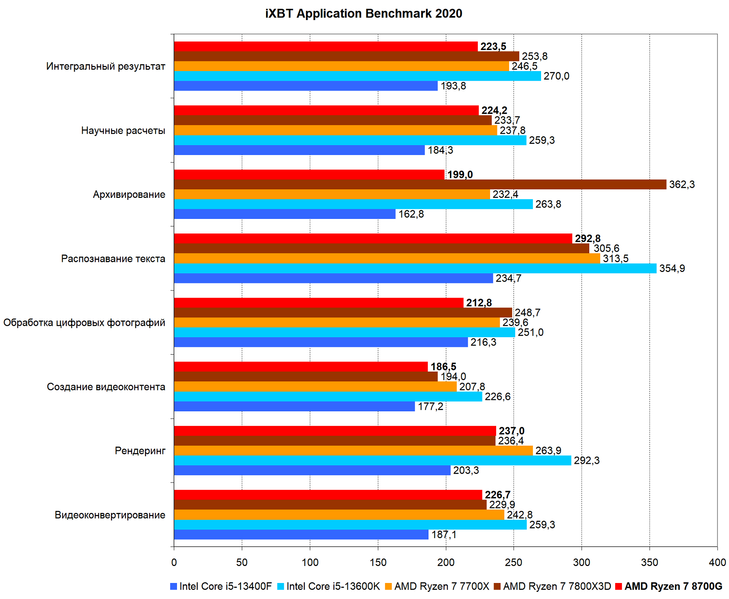 Если говорить о предельных цифрах, то аналогичный восьмиядерный Ryzen 7 7700X обеспечивает более чем на 20% бо́льшую производительность в играх по сравнению с Ryzen 7 8700G. Более того, даже куда менее дорогой Ryzen 5 7500F обеспечивает несколько бо́льшую производительность по сравнению с рассматриваемым сегодня гибридным процессором. Да и Core i5-13400F будет быстрее топового процессора серии Ryzen 8000G, не говоря уже о 13600K. Хорошо видно, что APU — далеко не лучший вариант для использования с дискретной графикой. Лучше выбрать обычный CPU хоть AMD, хоть Intel — они лучше справятся с работой в системах, ориентированных на дискретные видеокарты.