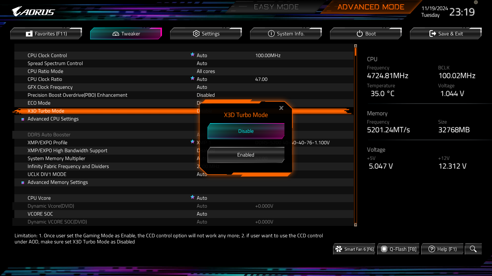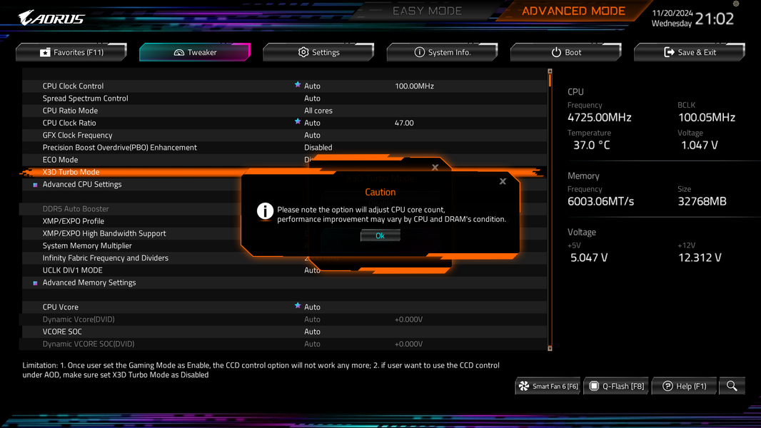 Также в этом разделе мы проверим специальный режим работы процессоров AMD, предназначенный специально для игр. У производителей системных плат он называется по-разному: X3D Turbo, X3D Gaming Mode, Turbo Game Mode и т. д., но суть одна — параметры работы Ryzen неким образом изменяются для того, чтобы система была лучше оптимизирована именно для игровых приложений. В BIOS тестовой системной платы Gigabyte Aorus это выглядит так, заодно выдается предупреждение об изменении количества ядер: