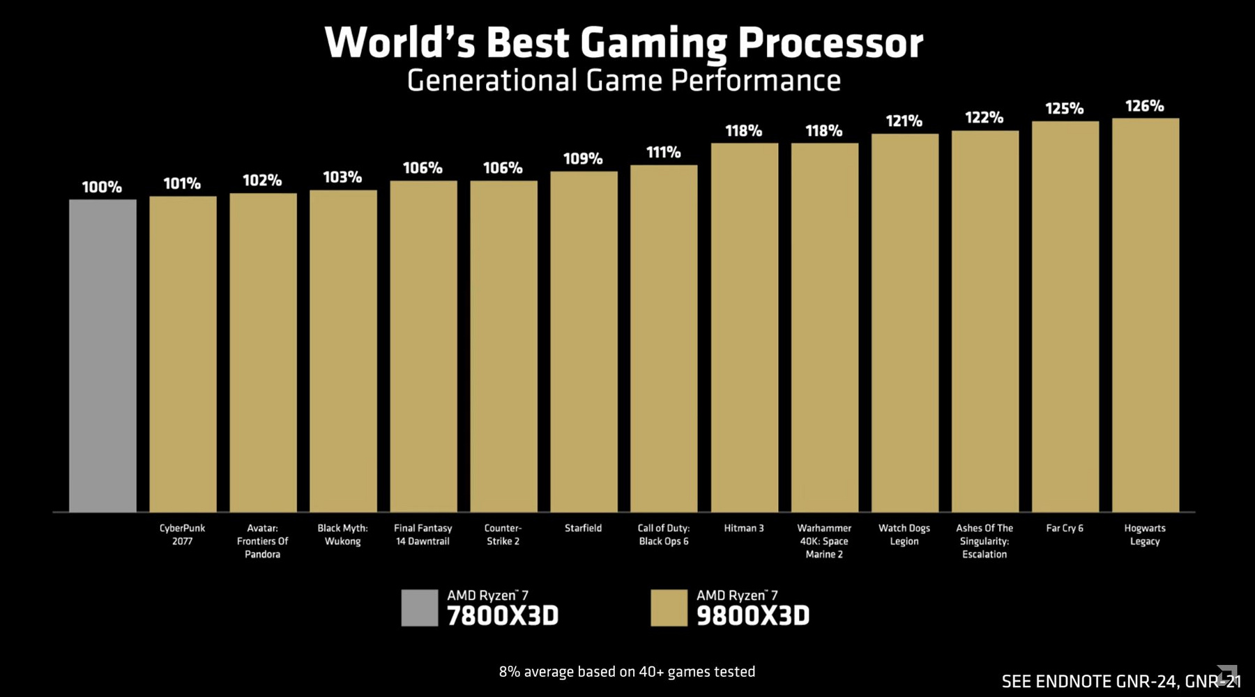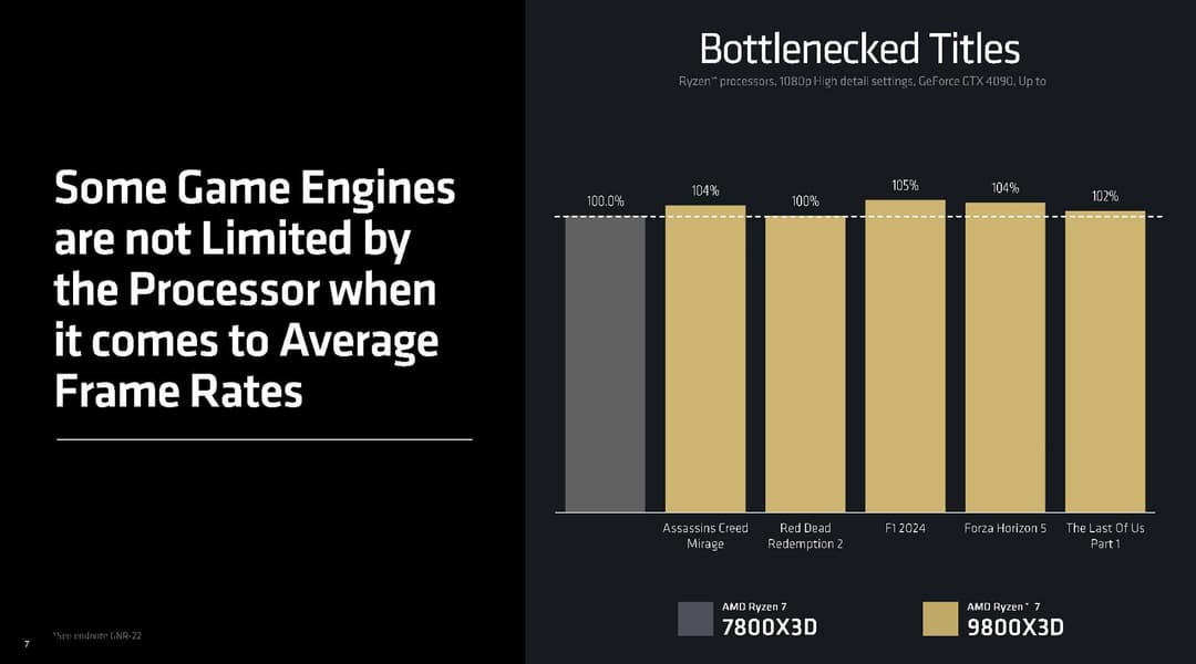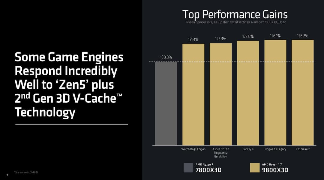 Собственное сравнение AMD нового процессора с Ryzen 7 7800X3D и Core Ultra 9 285K показывает явное превосходство новинки до 26% и 59%, соответственно. Но прирост скорости сильно зависит от игр — есть проекты, где скорость почти соответствует предыдущему игровому процессору 7800X3D, а есть игры, которые получают заметно ускорение и от улучшенных ядер Zen 5, вроде Far Cry 6. Мы проверим это в практической части исследования, а сейчас приведем примеры игр самой AMD как с максимальным приростом при переходе от Zen 4 к Zen 5, так и без упора в возможности вычислительных ядер, когда производительность зависит от чего-то еще.