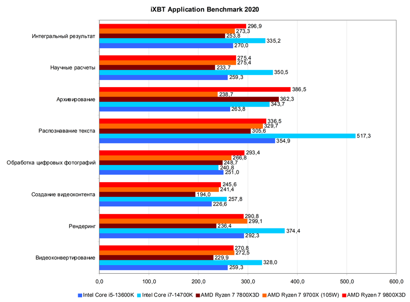 А вот сравнение нового процессора с соперниками Intel уже не столь радужное. Даже Core i5-13600K (почти то же самое, что и более новый 14600K) в среднем если и отстает от 9800X3D, то не сильно (кроме сжатия данных), а иногда даже оказывается быстрее — например, при распознавании текста. Ну а если сравнить новый игровой Ryzen 7 9800X3D с Core i7-14700K, то последний и вовсе выигрывает везде, кроме обработки фотографий и сжатия данных. Да, при заметно большем энергопотреблении, но всё же процессор Intel в среднем быстрее на приличные 13%. Так что Ryzen 7 9800X3D хоть и заметно улучшил позиции в неигровом ПО, но для полной компенсации разницы в количестве ядер этого всё же недостаточно.