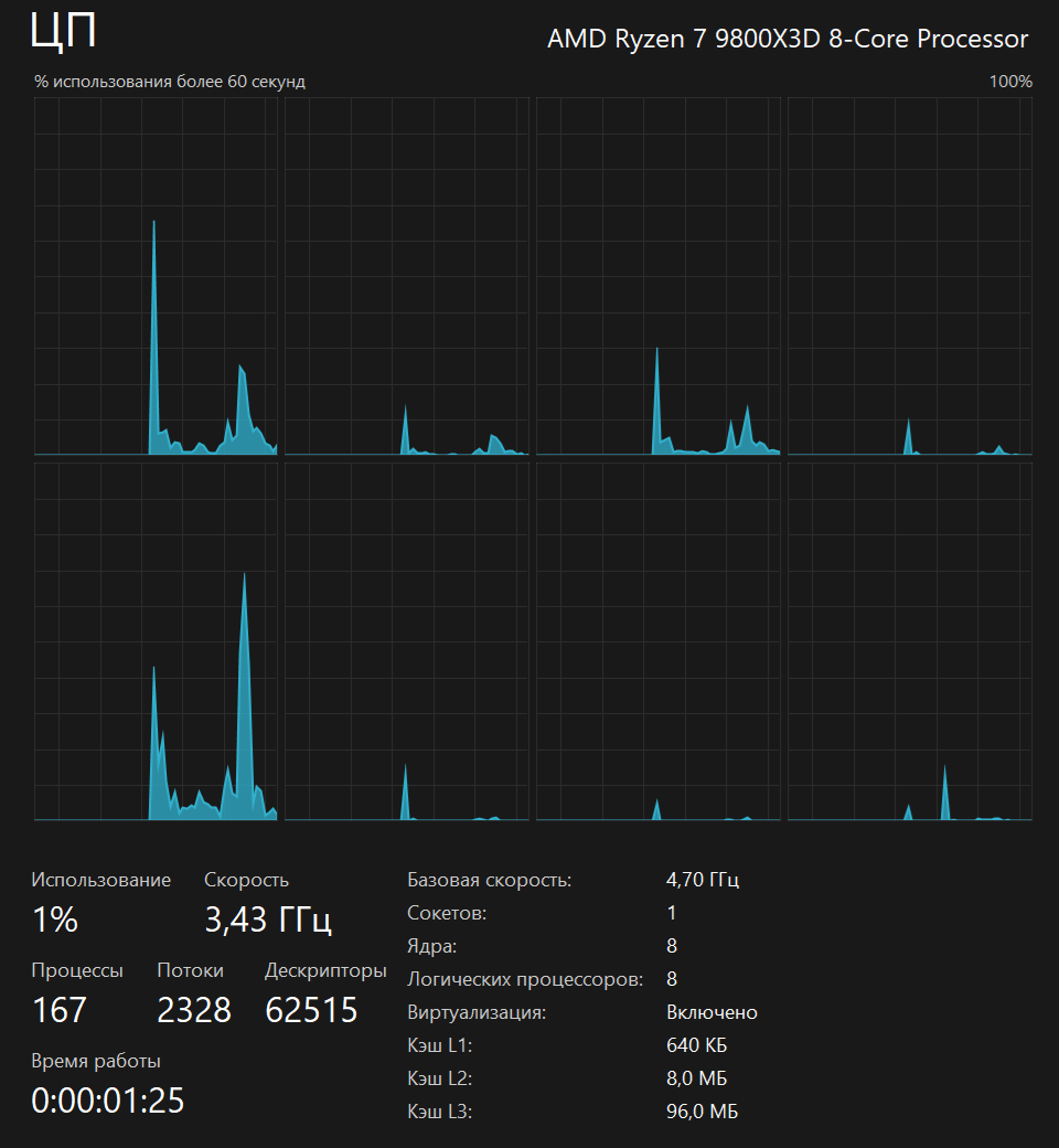 - AMD Ryzen 7 9800X3D (8 ядер/16 потоков, 4,7—5,2 ГГц)
