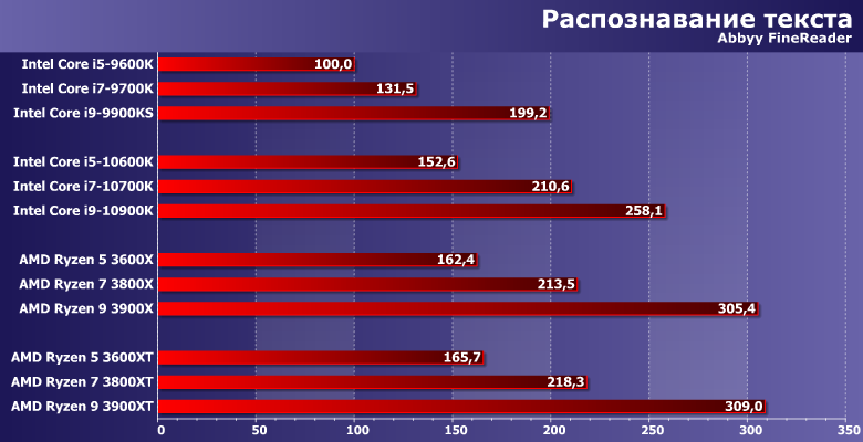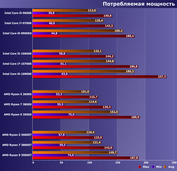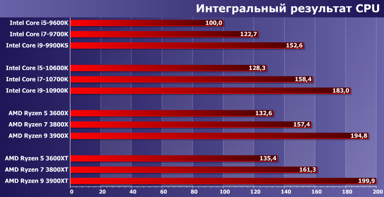 Прочее окружение традиционно: видеокарта AMD Radeon Vega 56, SATA SSD и 16 ГБ памяти DDR4. Тактовая частота памяти в большинстве случаев максимальная по спецификации процессоров. Технологии Intel Multi-Core Enhance и AMD Precision Boost Overdrive. Они (наряду с частотой памяти) на производительность немного повлиять могут, а их использование требования к плате и чипсету делают более конкретными, но в штатном режиме никаких проблем нет. Да и само по себе включение МСЕ без разгона увеличивает производительность Core i9-10900K лишь на 3% при росте энергопотребления на 5%, в чем мы уже убедились при знакомстве с ним. Поэтому практического смысла, на наш взгляд все равно не имеет: либо разгонять вручную тщательно (благо процессоры Intel все еще позволяют в данном случае добиваться каких-то интересных результатов), либо оставить все работать в штатном режиме.
