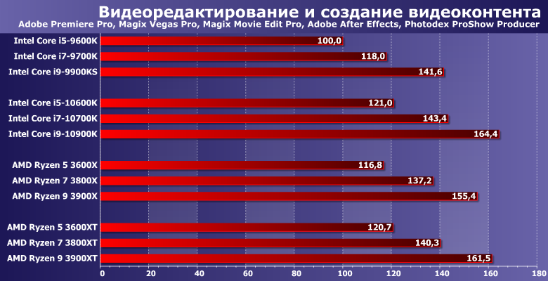 «Привес» больше — но, практически, за счет всего одного приложения, а именно Sony Vegas. Ранее мы списывали невысокую производительность в нем на плохую оптимизацию самой программы — в итоге Ryzen 9 еще и демонстрировали тот же результат, что и Ryzen 7. Оказалось, что виноваты не только программисты — «оттюнингованные» Ryzen стали работать заметно быстрее. И такое тоже возможно — как и предполагалось в начале. Но принципиально, опять же, ничего не изменилось — Core по-прежнему чуть-чуть, но быстрее. Но дороже. В общем, нормальная конкуренция — а не тот погром, что был всего несколько месяцев назад.