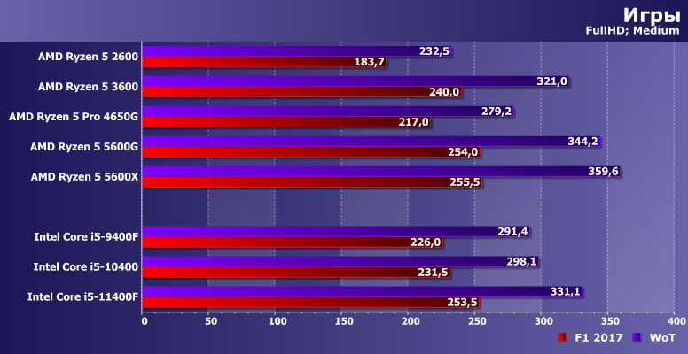 С другой стороны, и 5600G все-таки дороговат. Младшие модели процессоров Intel медленноваты из-за низких тактовых частот (что дополнительно усугубляется лимитами энергопотребления), зато недороги. При этом понятно, что в более приближенных к реальности настройкам качества, тот же 10400 (или лучше 11400) все равно в игровом ПК сможет работать на всю видеокарту. А если так, то зачем платить больше?