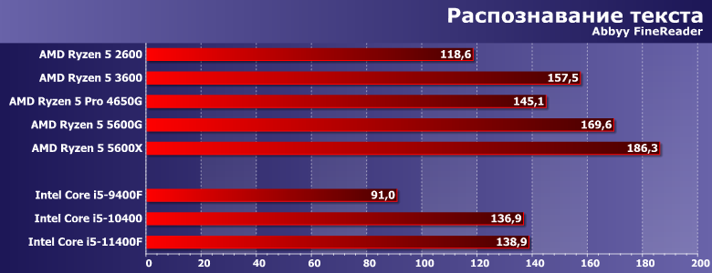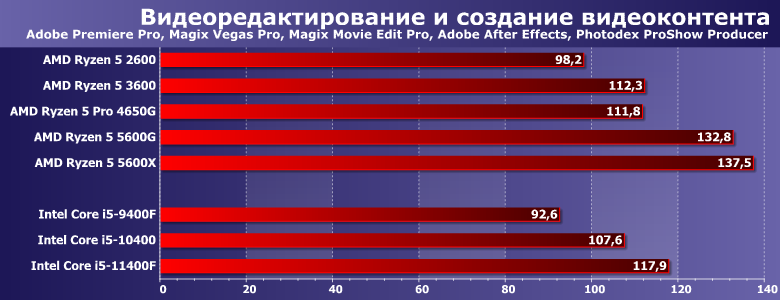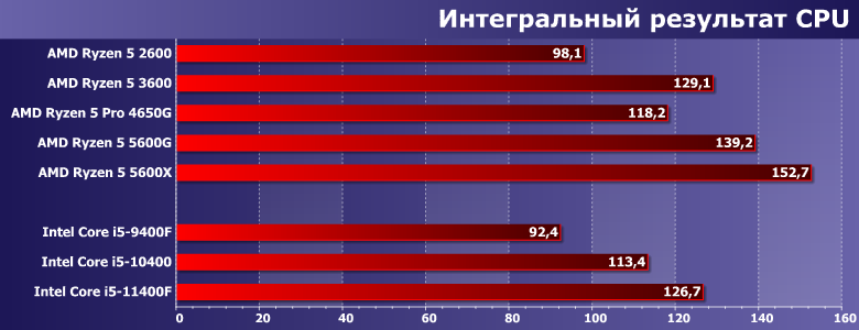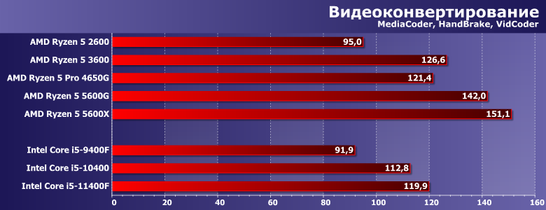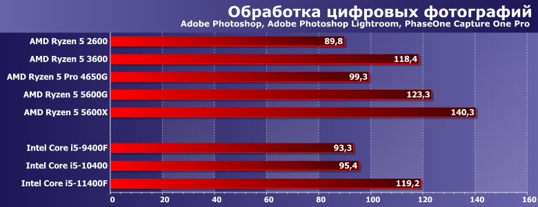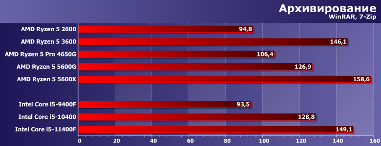 Характер нагрузки схожий — предпочтения программ немного другие. В частности, меньше «кэшелюбивость», так что APU от ограниченности L3 не страдают. 4650G оказался даже не хуже 3600Х — и, соответственно, быстрее 3600. 5600G на такой подвиг оказался неспособен — хотя и все равно оказался вторым среди всех участников. А вот 11400F в данном случае ограничения теплопакета тоже мешают — зато переработанный FPU позволяет выйти хотя бы на уровень Zen2. И прирост производительности за три года уже ближе к 40%. Но у AMD по-прежнему порядка полутора.