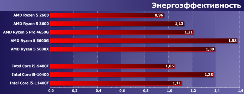 ...поскольку экономичных Rocket Lake тоже нет. На первый взгляд таким кажется Core i5-11400F, но только потому, что его железной рукой загоняли в те рамки, в которых предшественникам было попросту просторно. Загнали — попутно заставив процессор работать медленнее, чем он мог бы. И все равно лишних 20—30 Вт набежало. А если попробовать снять ограничения, то и этот малыш улетает под те же 200 Вт, что и старшие модели линейки. У AMD же таких «особенностей» нет. И вообще — Zen3 при том же техпроцессе стал (во всех видах) экономичнее Zen2. А монолитные APU потребляют меньше энергии, нежели «чистые» процессоры.