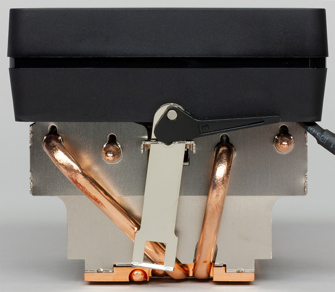 Радиатор представляет собой связанные в единую конструкцию подошву из толстой медной пластины, четыре тепловые медные трубки и ребра, изготовленные из никелированного алюминия.