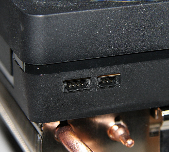На боковой плоскости кожуха находятся два разъема, закрытые резиновыми заглушками, и неприметный движок. О разъемах — ниже, а движок переключает режим работы вентилятора — пониженная (L) или повышенная (H) скорость вращения. Крыльчатка вентилятора изготовлена из прозрачного пластика и снаружи слегка заматирована. На статоре вентилятора размещены четыре RGB-светодиода, которые подсвечивают крыльчатку изнутри.