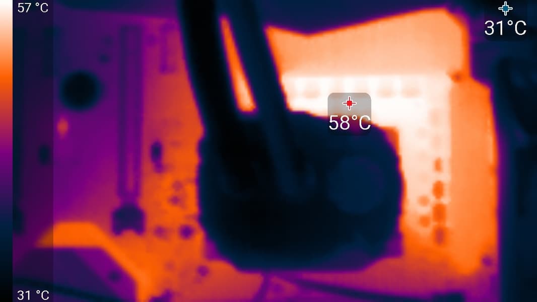 В данном случае эффект заключается в снижении температуры на 8 градусов, что уже хорошо. По данным мониторинга с помощью встроенного в материнскую плату датчика температуры VRM разница чуть меньше — 51 градус при работающем вентиляторе и 57 градусов при заблокированном.