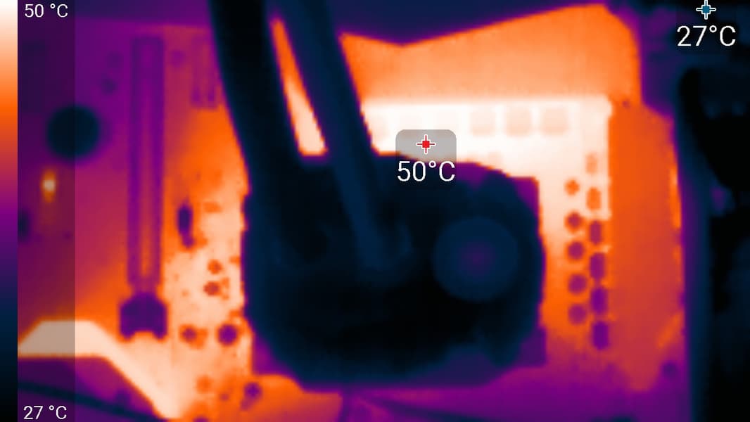 Проведем практический тест. Сначала хорошо прогреем VRM (описание нагрузки есть ниже) до постоянной температуры. Потом заблокируем вентилятор на помпе и, опять дождавшись постоянной температуры посмотрим, насколько повысится температура радиатора VRM. Использовалась материнская плата Asus ROG Crosshair VI Extreme и процессор AMD Ryzen 9 3950X: