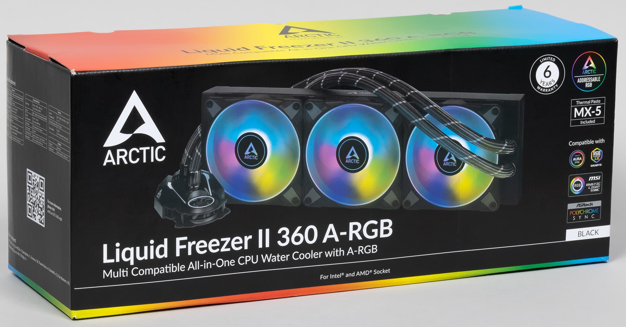 Поставляется система жидкостного охлаждения Arctic Liquid Freezer II 360 A-RGB в коробке из среднего по толщине гофрированного картона. Оформление коробки красочное. На внешних плоскостях коробки не только изображен сам продукт, но и перечислены технические характеристики, указана комплектация и есть QR-коды для удобного перехода по ссылкам на раздел поддержки, на интерактивное руководство и на страницу продукта. Надписи преимущественно на английском, но перечисление особенностей продублировано на нескольких языках, включая русский. Для защиты и распределения деталей используются внутренние коробки и вкладыши из гофрированного картона и полиэтиленовые пакеты. Подошва теплосъемника защищена пластиковой пленкой.