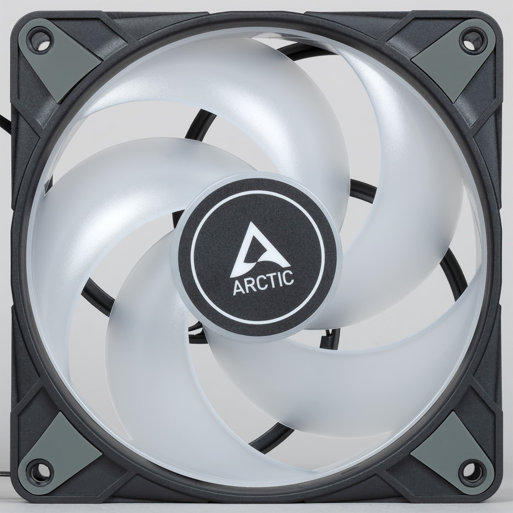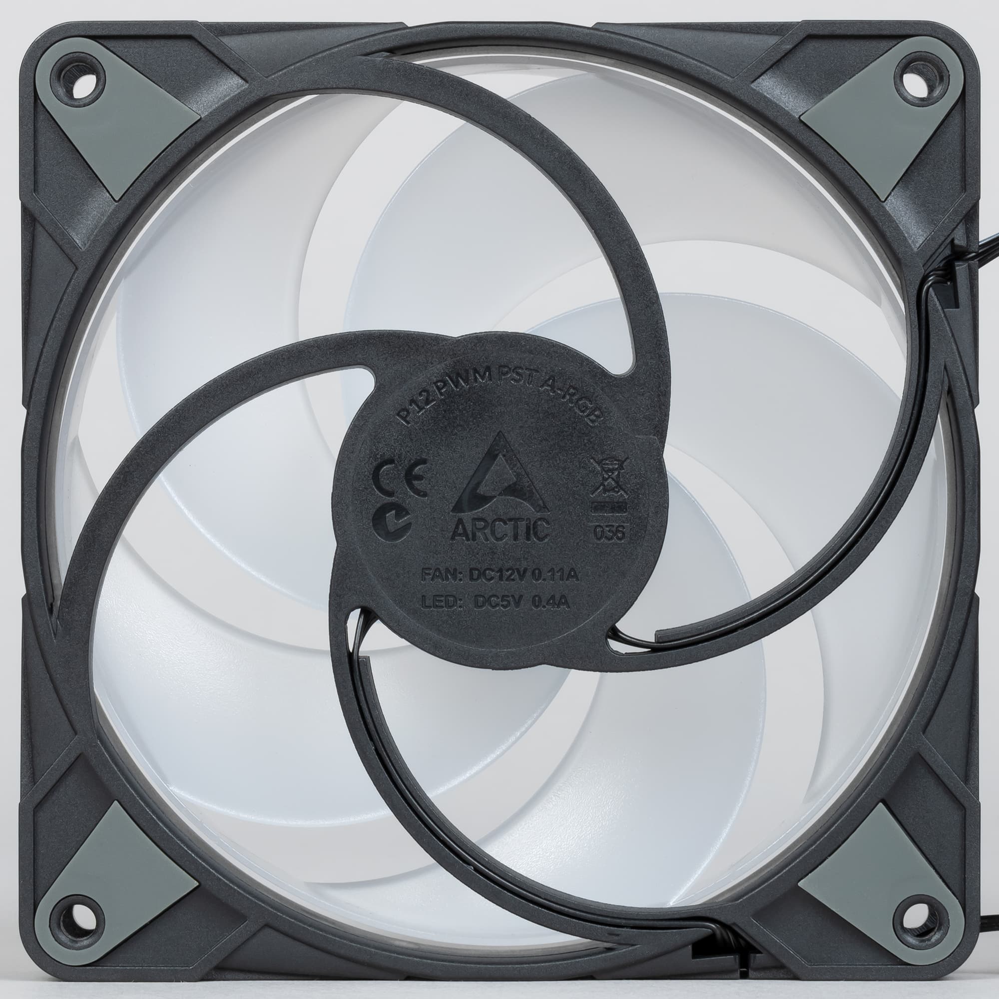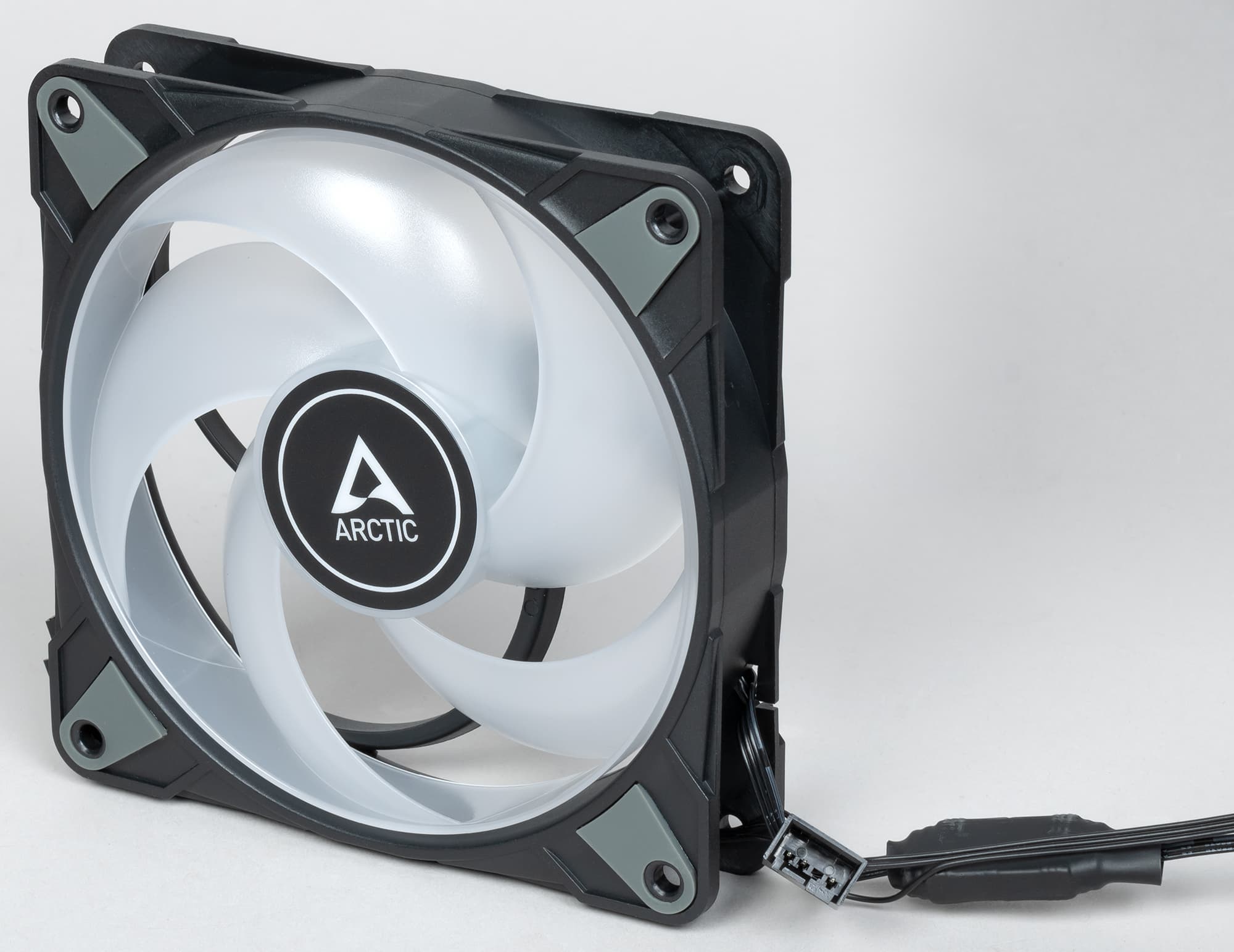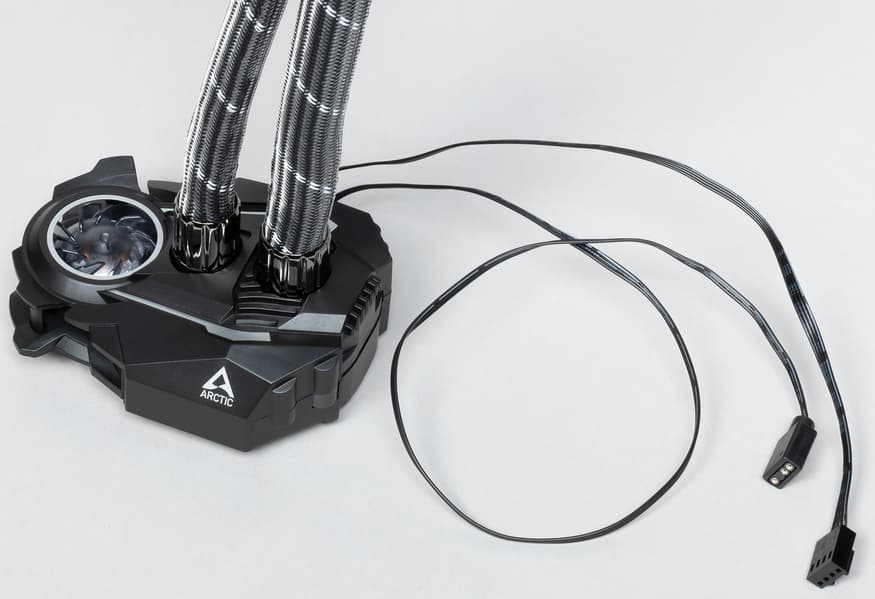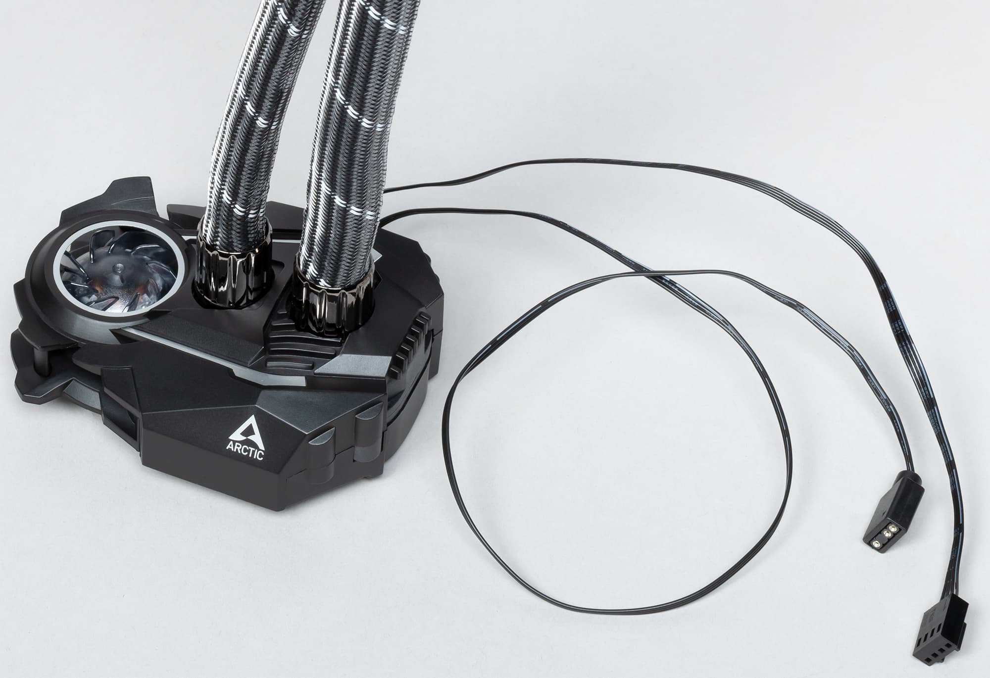 Крыльчатка вентилятора изготовлена из белого полупрозрачного пластика и снаружи слегка заматирована. На статоре вентилятора размещены RGB-светодиоды, которые подсвечивают крыльчатку изнутри. Кабели подсветки от вентиляторов соединены последовательно к кабелю-удлинителю, которой также, как и кабель питания пропущен под оплеткой шланга и выведен от помпы вместе с кабелем питания все системы. Длина кабеля подсветки, отходящего от помпы, равна 46 см. Применяется трехпроводная адресуемая RGB-подсветка. Предполагается, что пользователь будет подключать подсветку вентиляторов к трехконтактному разъему для подсветки на материнской плате или на другом контроллере.