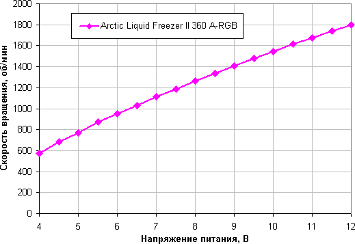 Изменение скорости вращения также плавное, но диапазон регулировки с помощью напряжения заметно у́же. Вентиляторы останавливаются при 3,5—3,8 В, а при 4,4—5,1 В запускаются. Видимо, их лучше не подключать к 5 В. Вентилятор на помпе останавливается при 3,9 В, а запускается только при 8,2 В. Насчет самой помпы непонятно, так как отследить ее вращение сложно. В целом, управлять работой этой системы с помощью регулировки напряжения особого смысла нет.