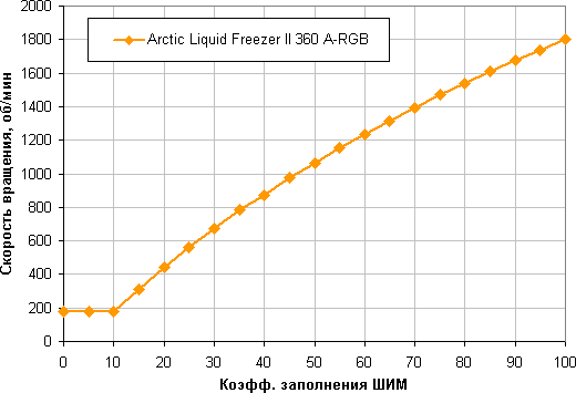 Отличный результат — очень широкий диапазон регулировки и плавный рост скорости вращения при изменении коэффициента заполнения от 10% до 100%. При снижении коэффициента заполнения (КЗ) до 0 вентиляторы не останавливаются. Это может иметь значение, если пользователь хочет создать гибридную систему охлаждения, которая при низкой нагрузке работает полностью или частично в пассивном режиме.