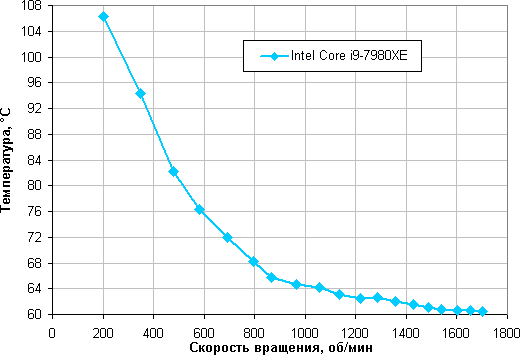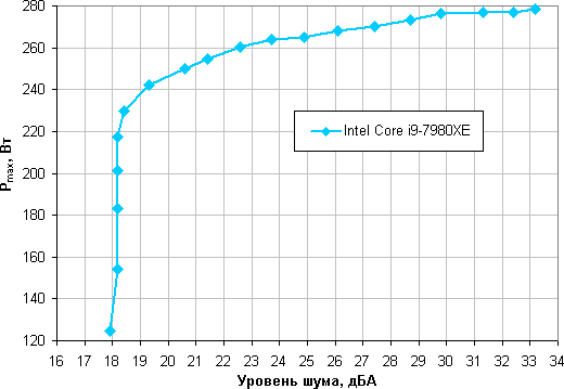 Приняв 25 дБА за критерий условной бесшумности, получим примерную максимальную мощность процессоров, соответствующих этому уровню. Это порядка 265 Вт для процессора Intel Core i9-7980XE. Если не обращать внимания на уровень шума, то пределы мощности можно увеличить где-то до 280 Вт. Еще раз уточним, это в жестких условиях обдува радиатора нагретым до 44 градусов воздухом, при снижении температуры воздуха указанные пределы мощности для бесшумной работы и максимальной мощности возрастают.