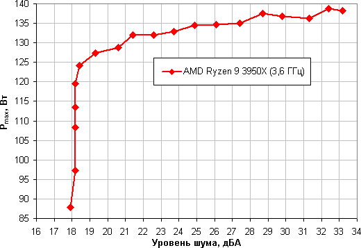 Приняв 25 дБА за критерий условной бесшумности, получим, что максимальная мощность процессора, соответствующая этому уровню, составляет порядка 135 Вт. Если не обращать внимания на уровень шума, то предел мощности можно увеличить, но всего до 138 Вт. Еще раз уточним: это в жестких условиях обдува радиатора нагретым до 44 градусов воздухом. При снижении температуры воздуха указанные пределы мощности для бесшумной работы и максимальной мощности возрастают. Результат заметно хуже, чем в случае процессора Intel Core i9-7980XE. Впрочем, при условии достаточно хорошей вентиляции в корпусе данный кулер вполне справится с охлаждением процессора AMD Ryzen 9 3950X, но на возможность существенного разгона рассчитывать уже не стоит.
