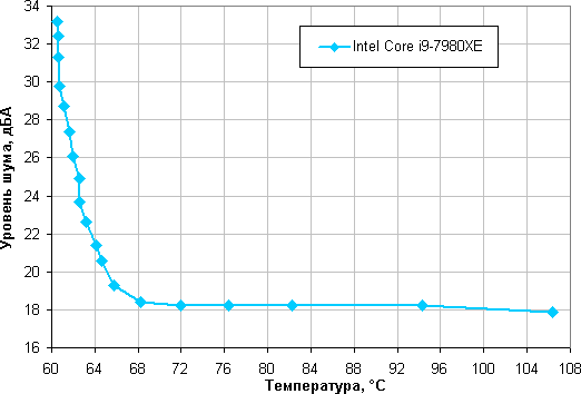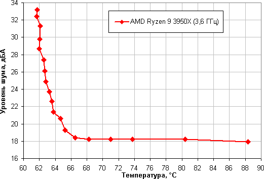 Зависимость уровня шума от температуры процессора при полной загрузке: