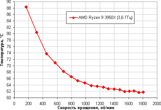 Зависимость температуры процессора при его полной загрузке от скорости вращения вентиляторов: