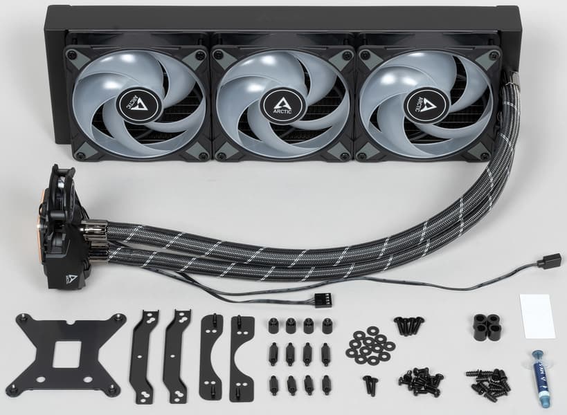 Внутри коробки находятся радиатор с установленными вентиляторами и с подключенной помпой, комплект крепежа и термопаста в шприце.