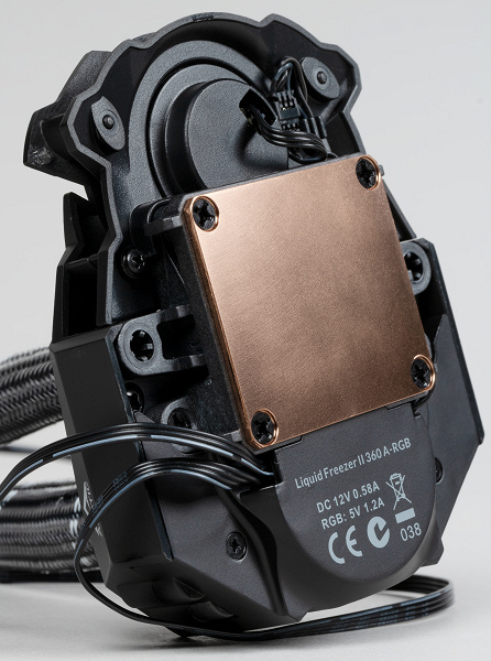 Помпа интегрирована в один блок с теплосъемником. Подошвой теплосъемника, непосредственно прилегающей к крышке процессора, служит медная пластина. Ее внешняя поверхность шлифованная и слегка полированная. Поверхность подошвы почти идеально плоская.