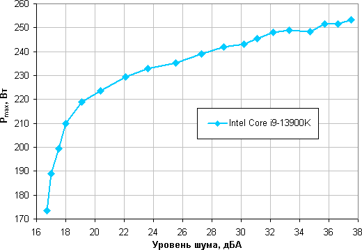 Приняв 25 дБА за критерий условной бесшумности, получим примерную максимальную мощность процессоров, соответствующих этому уровню. Это порядка 235 Вт для процессора Intel Core i9-13900K. Если не обращать внимания на уровень шума, то пределы мощности можно увеличить примерно до 250 Вт. Еще раз уточним, это в жестких условиях обдува радиатора нагретым до 44 градусов воздухом, при снижении температуры воздуха и/или увеличении максимально допустимой температуры процессора (для него допустимы 100 °C) указанные пределы мощности для бесшумной работы и максимальной мощности возрастают.