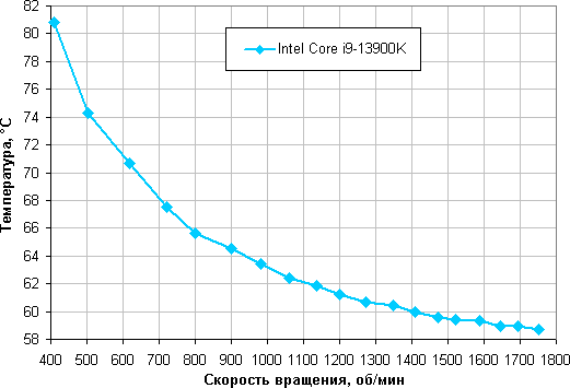 В этом тесте процессор Intel Core i9-13900K не перегревается (при 24 градусов окружающего воздуха) на оборотах вентиляторов, достигаемых при снижении КЗ до 10% (и ниже), что соответствует примерно 400 об/мин. При этом максимальное потребление по данным мониторинга составило порядка 218 Вт, а по разъемам для питания процессора — 274 Вт. Напомним, что базовая мощность этого процессора составляет всего 125 Вт, а штатная максимальная кратковременная (турбо-лимит) — 253 Вт.