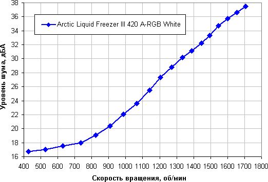 Уровень шума этой системы охлаждения меняется в широком диапазоне, но максимум не высокий. Зависит, конечно, от индивидуальных особенностей и других факторов, но где-то от 40 дБА и выше шум, с нашей точки зрения, очень высокий для настольной системы; от 35 до 40 дБА уровень шума относится к разряду терпимых; ниже 35 дБА шум от системы охлаждения не будет сильно выделяться на фоне типичных небесшумных компонентов ПК — корпусных вентиляторов, вентиляторов на блоке питания и на видеокарте, а также жестких дисков; а где-то ниже 25 дБА кулер можно назвать условно бесшумным. Фоновый уровень был равен 16,3 дБА (условное значение, которое показывает шумомер).