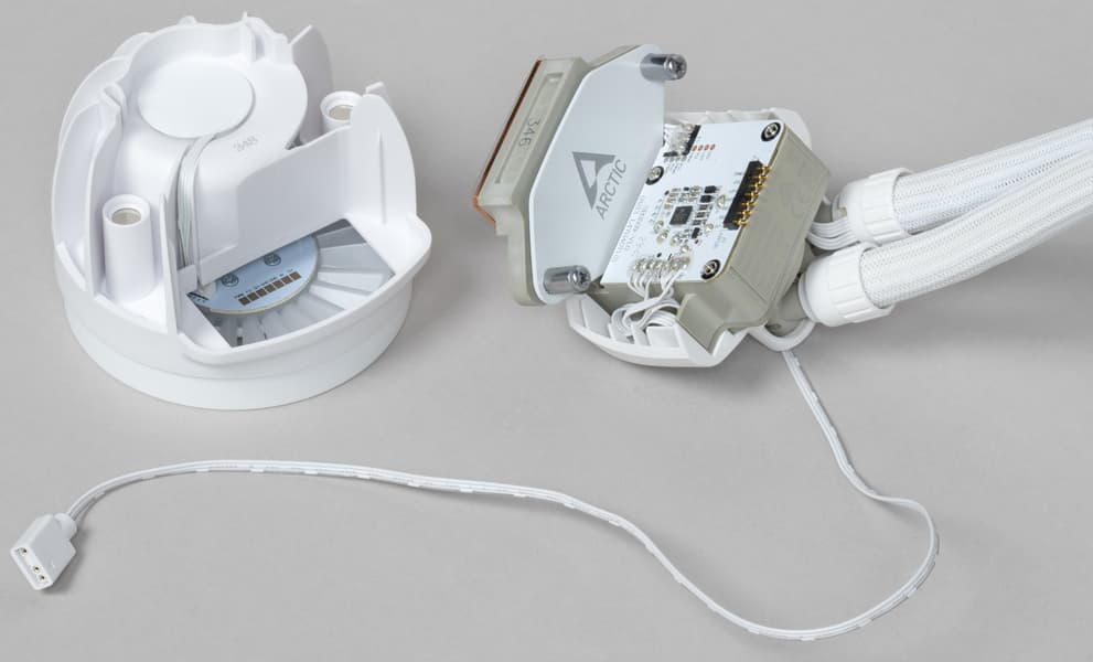 Форма крыльчатки вентилятора намекает на способность вентилятора создавать высокое статическое давление, что в данном случае и нужно. Лопасти крыльчатки заключены в кольцо, что может повышать эффективность вентилятора. Крыльчатка вентилятора изготовлена из белого полупрозрачного пластика. На статоре вентилятора по окружности размещены ARGB-светодиоды, которые подсвечивают крыльчатку изнутри. Кабели от вентиляторов оснащены стандартными четырех- и трехконтактными разъемами для подключения моторов и адресуемой подсветки (последний дополнен проходным разъемом для подключения цепочкой).