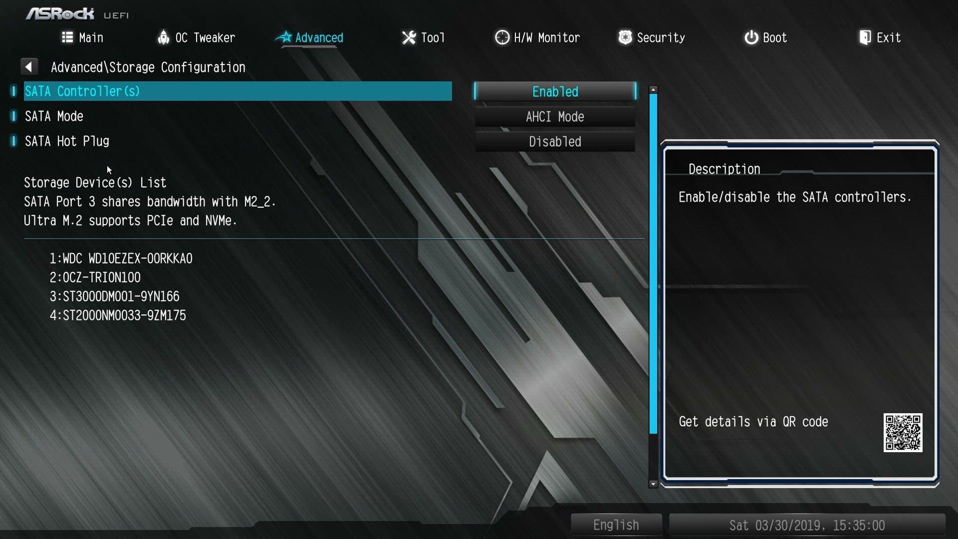 Всего у платы 4 разъема Serial ATA 6 Гбит/с + 2 слота M.2 для накопителей. Все (кроме первого M.2.) реализовано средствами чипсета B450. Поддерживается создание массивов RAID 0, RAID 1 и RAID 10.