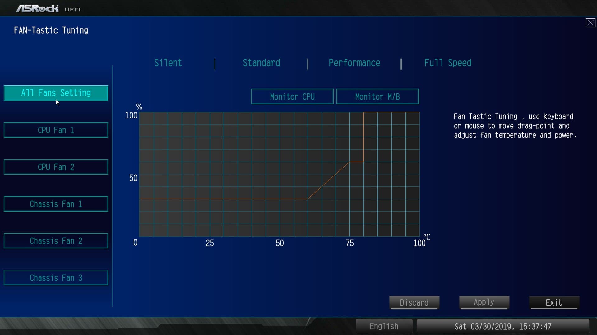 Оставшиеся настройки касаются работы вентиляторов (ничем не отличается от меню в программе A-Tuning), мониторинга в целом работы платы и опций загрузки.