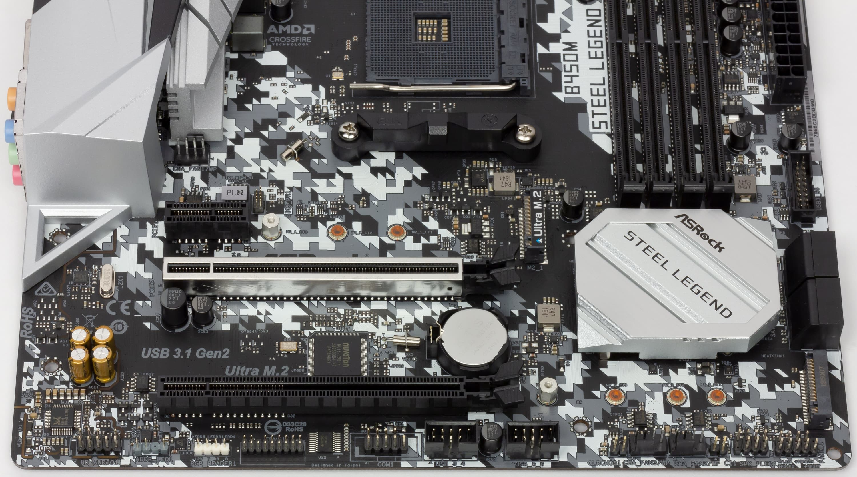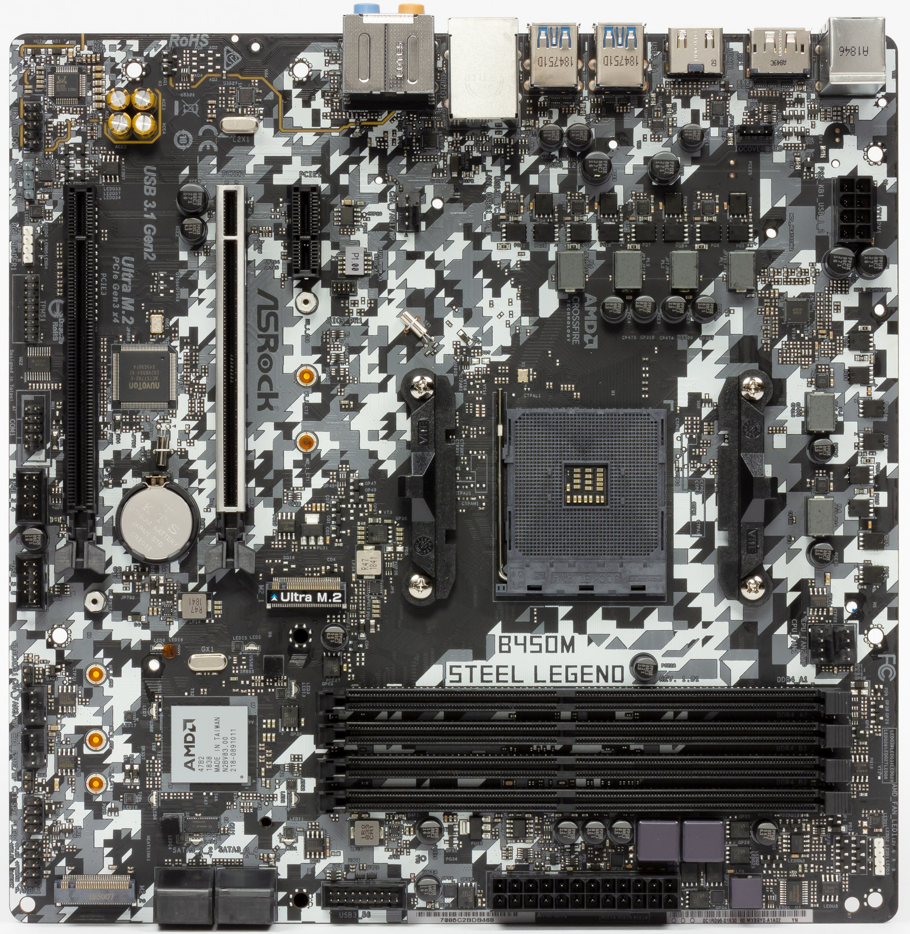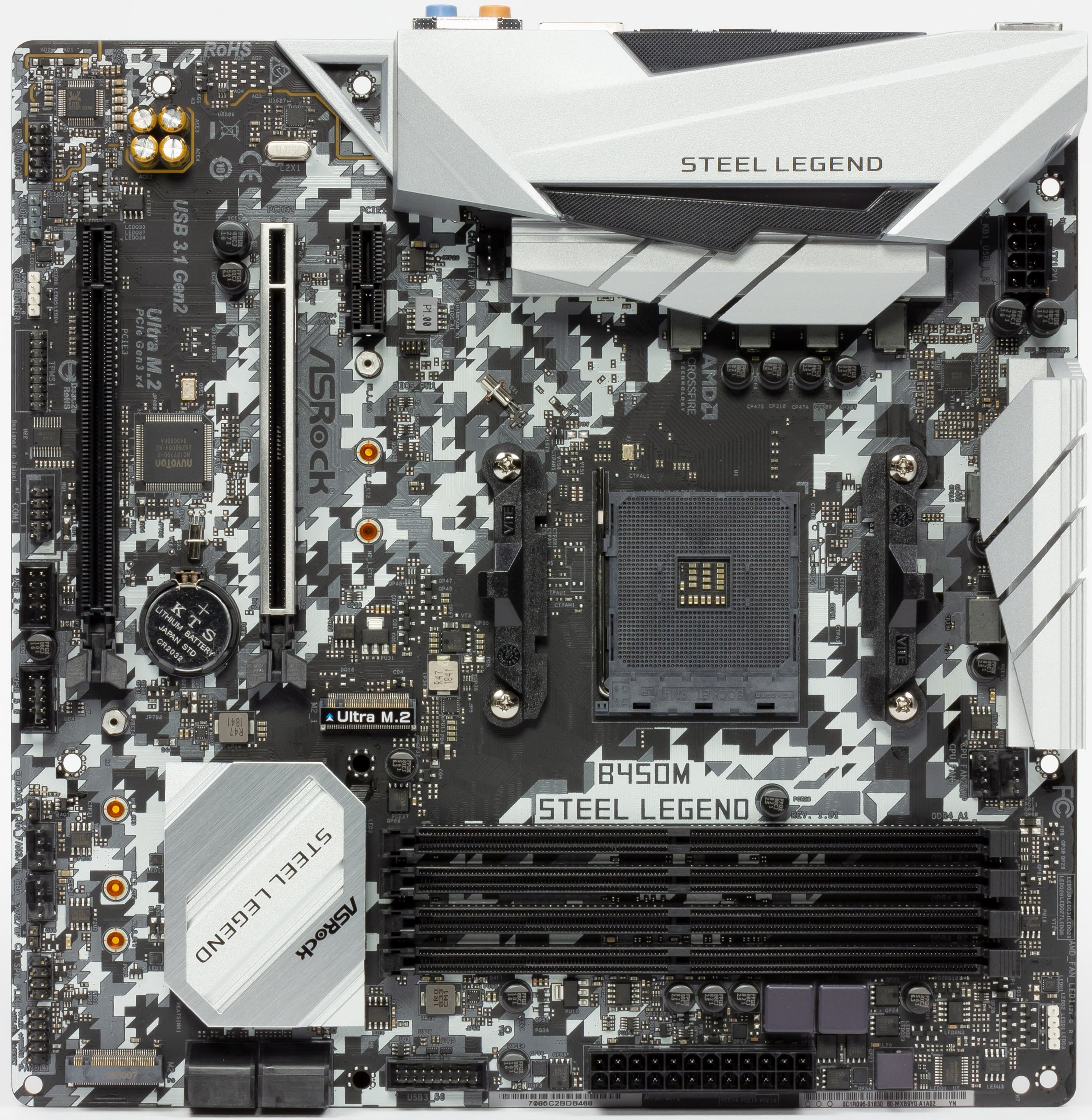 Материнская плата ASRock B450M Steel Legend выполнена в форм-факторе microATX, имеет размеры 245×240 мм и 8 монтажных отверстий для установки в корпус. Следует отметить, что практически все материнские платы у компании ASRock имеют дизайнерские окраски самих печатных плат. В серии Taichi — шестеренки вечной машины, Phantom — стрелы, а здесь мы видим серебристо-белый окрас с малопонятными хаотичными серыми вставками, причем общая канва дизайна — снова диагонально пересекающие плату линии.