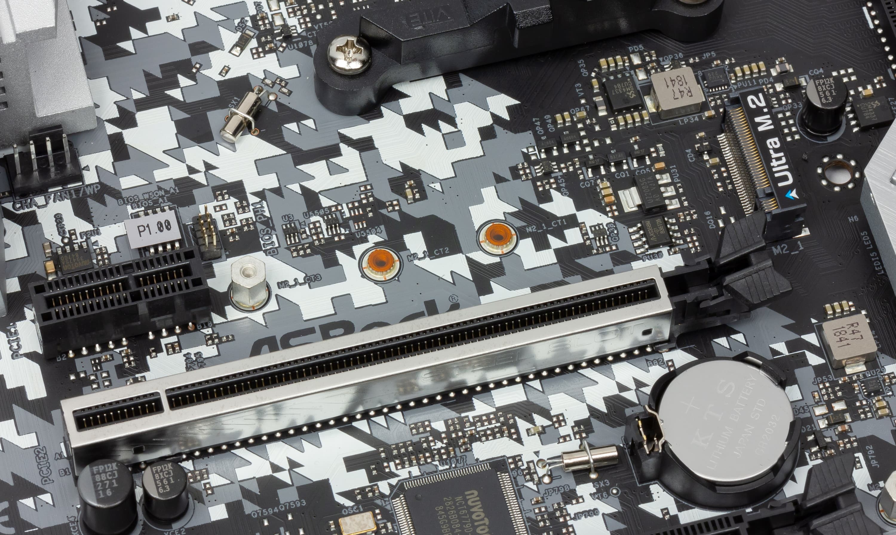 Первый слот M.2 (Ultra M.2 — его хорошо видно на картинке выше, рядом со слотом PCI-E x16) поддерживает все современные типы накопителей, с интерфейсом PCI-E 3.0 x4/x2 и с максимальным размером 2280. Этот слот расположен на уровне PCI-E x1 слота и выше первого слота PCI-E x16, так что установленная видеокарта не мешает работе с M.2-накопителем.