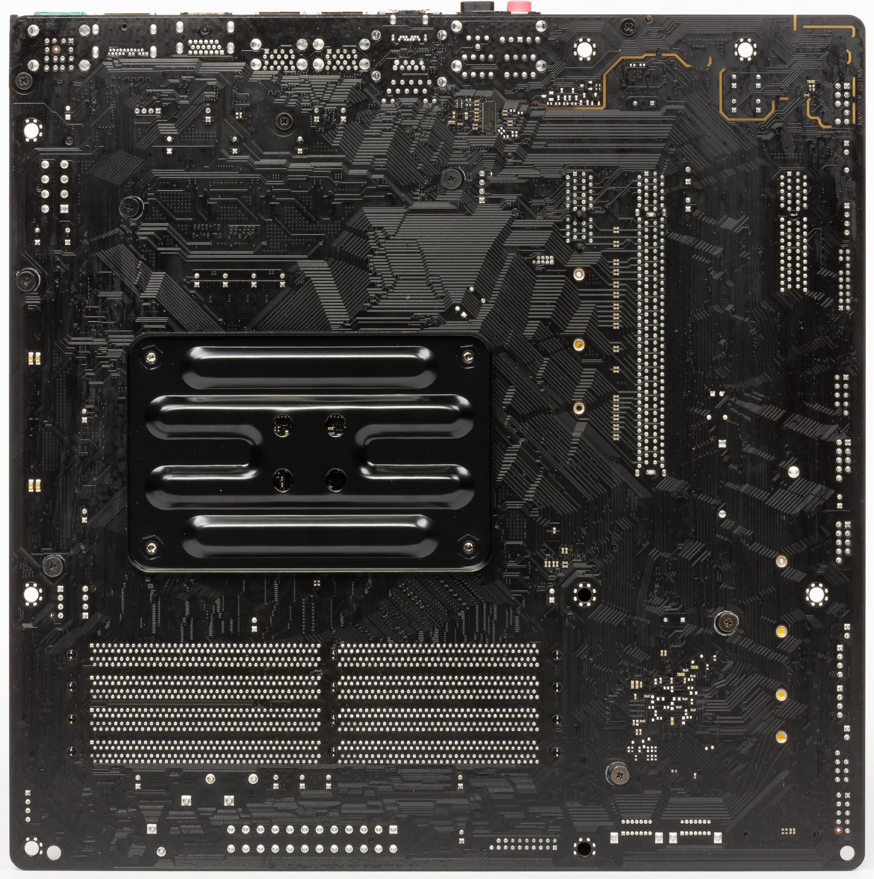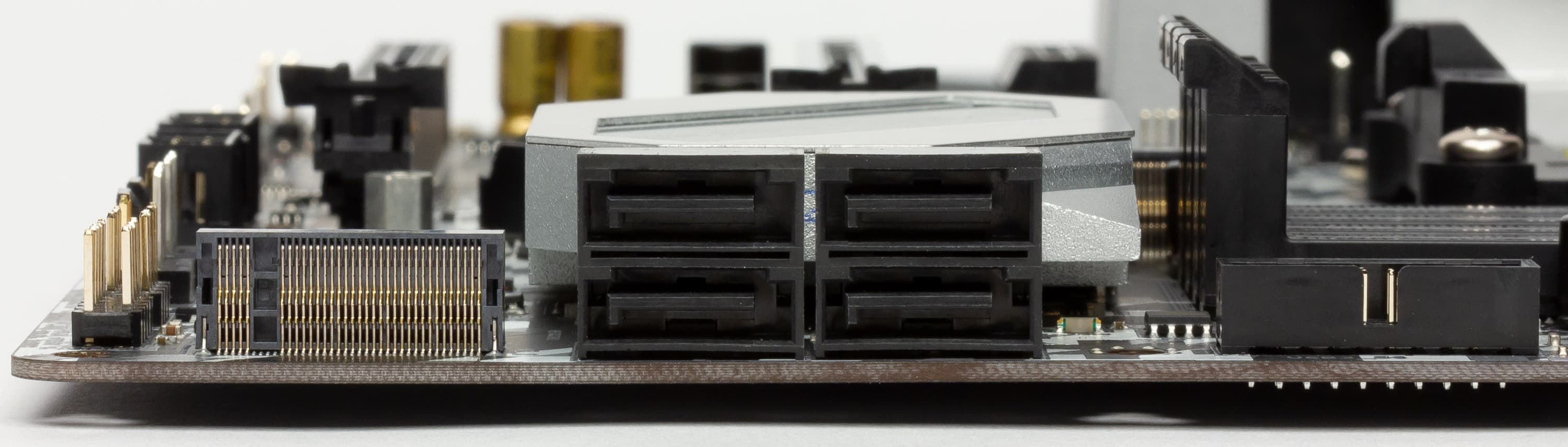 Второй слот M.2. расположен за вторым PCI-E x16 (его заднюю часть видно на снимке выше слева от SATA-портов). Он также поддерживает накопители с максимальным размером 2280, но уже только с интерфейсом SATA.