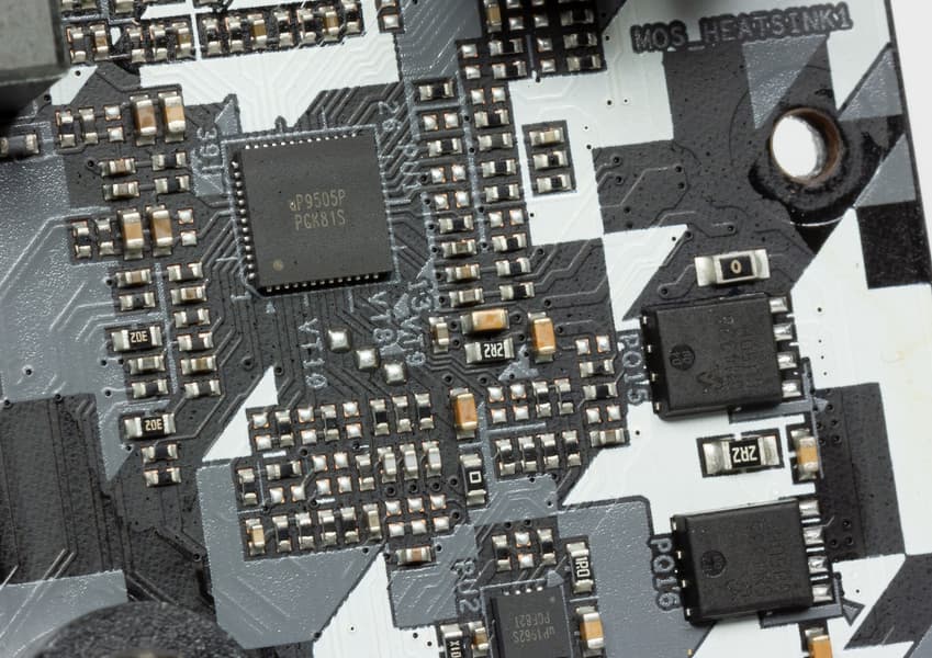 Система питания процессора организована по схеме 4 (ядра) + 2 (блоки ввода-вывода) фазы. Управляет схемой ШИМ-контроллер uPI uP9505P.