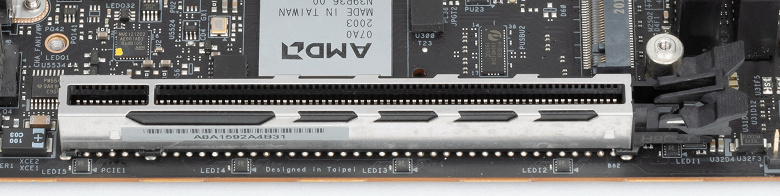 В отличие от слотов для памяти, слот PCIe x16_1 имеет металлическое армирование из нержавеющей стали, которое увеличивает надежность слота и предохраняет от электромагнитных помех.