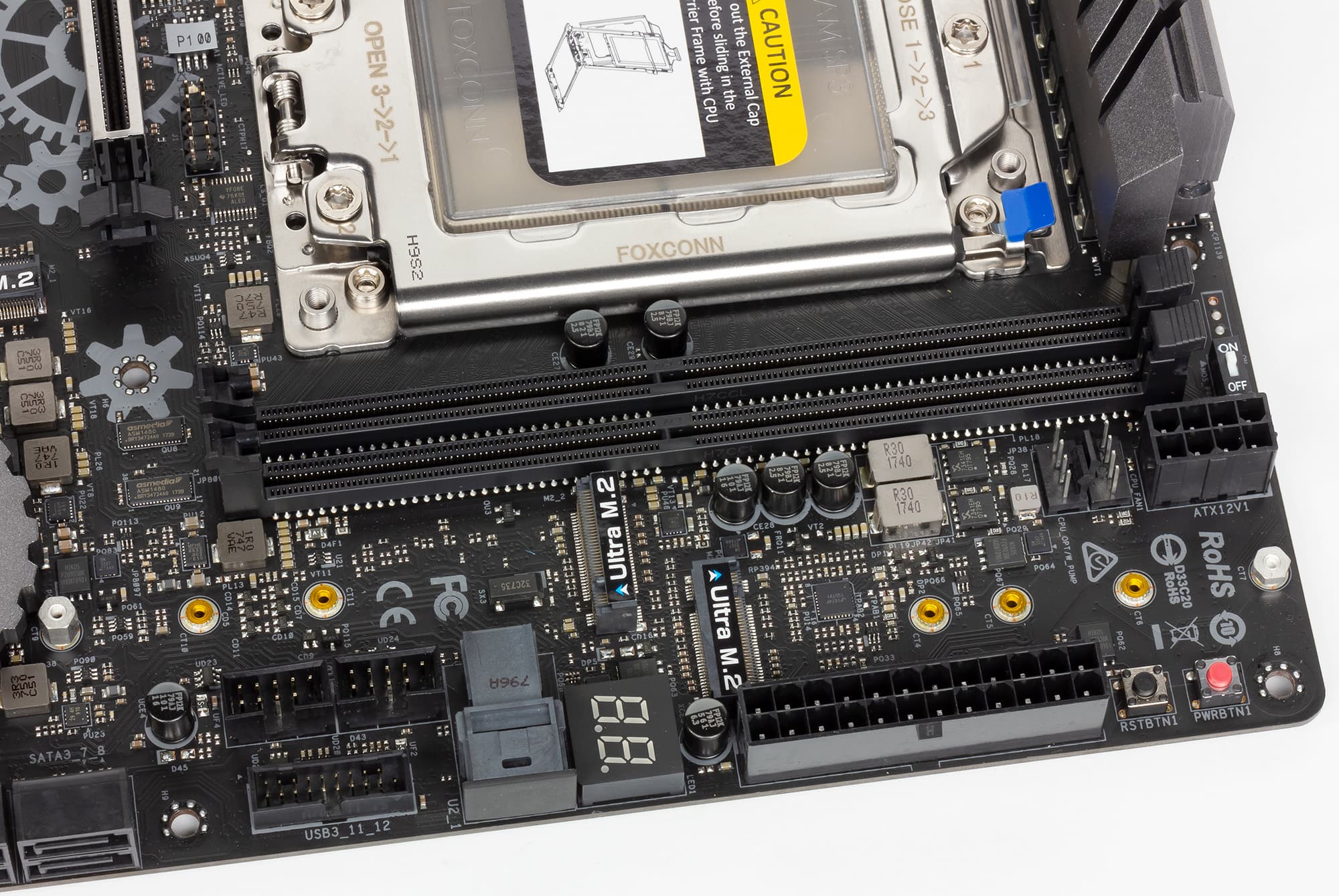 Поместить в дополнение к 24-контактному разъему для подключения блока питания два 8-контактных на компактной плате не получилось, так что и тут тоже компромисс: 24+8+4. Вообще говоря, даже системы на Ryzen Threadripper 2990WX в штатном режиме отлично обходятся 24-контактным и 4-контактным разъемами, несмотря на потребление в 350 Вт, но при наличии возможности все же стоит задействовать все — во избежание обгорания контактов и прочих нежелательных побочных эффектов.