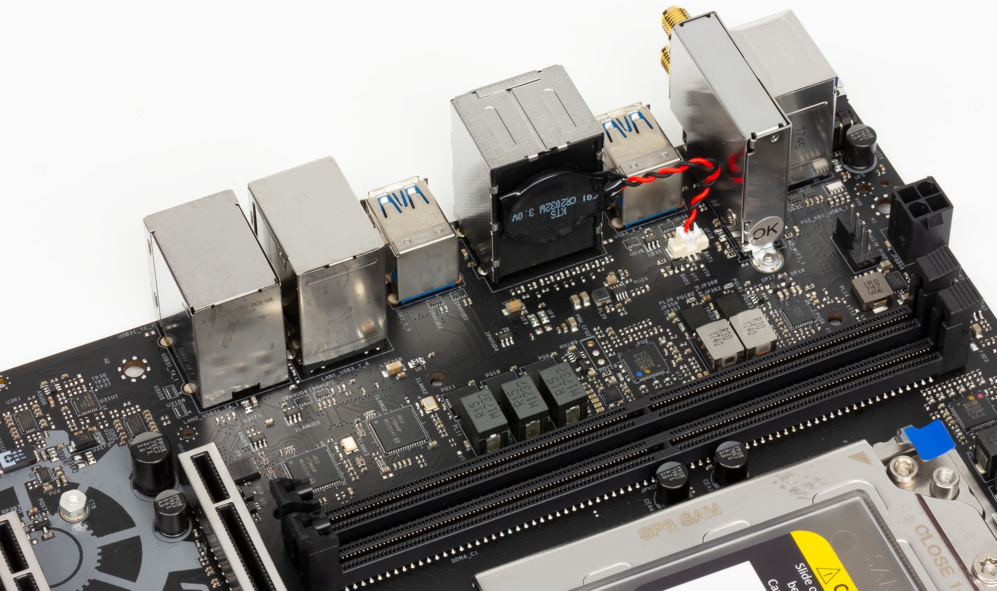 Кроме того, на плате есть и беспроводной адаптер Intel Dual Band Wireless-AC 8265: с поддержкой двухдиапазонного Wi-Fi со скоростью до 866 Мбит/с и Bluetooth 4.2. Вместе с парой проводных портов это, опять же, провоцирует на сборку на базе платы мощного сервера приложений, заодно и полностью обеспечивающего небольшую компанию всем необходимым для подключения в интернет: функциональность роутера, файрвола и т. п. можно как раз на него и возложить (заодно при желании «повесив» сюда же собственный почтовый и web-серверы). Мощность платформы для всего этого даже избыточна, да и возможности по подключению накопителей велики.