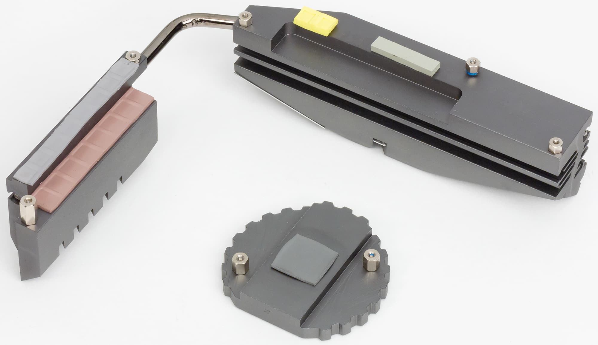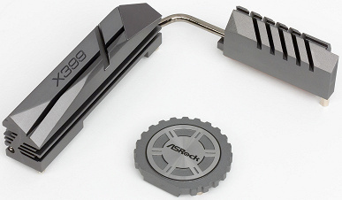 Система охлаждения платы состоит из трех радиаторов. Два расположены по двум смежным сторонам процессорного разъема, соединены тепловой трубкой и предназначены для отвода тепла от элементов регулятора напряжения питания процессора. Еще один охлаждает чипсет. Достаточно просто — все-таки продукт относится, скорее, к прошлому году, когда идея охлаждения M.2-накопителей еще не овладела массами.