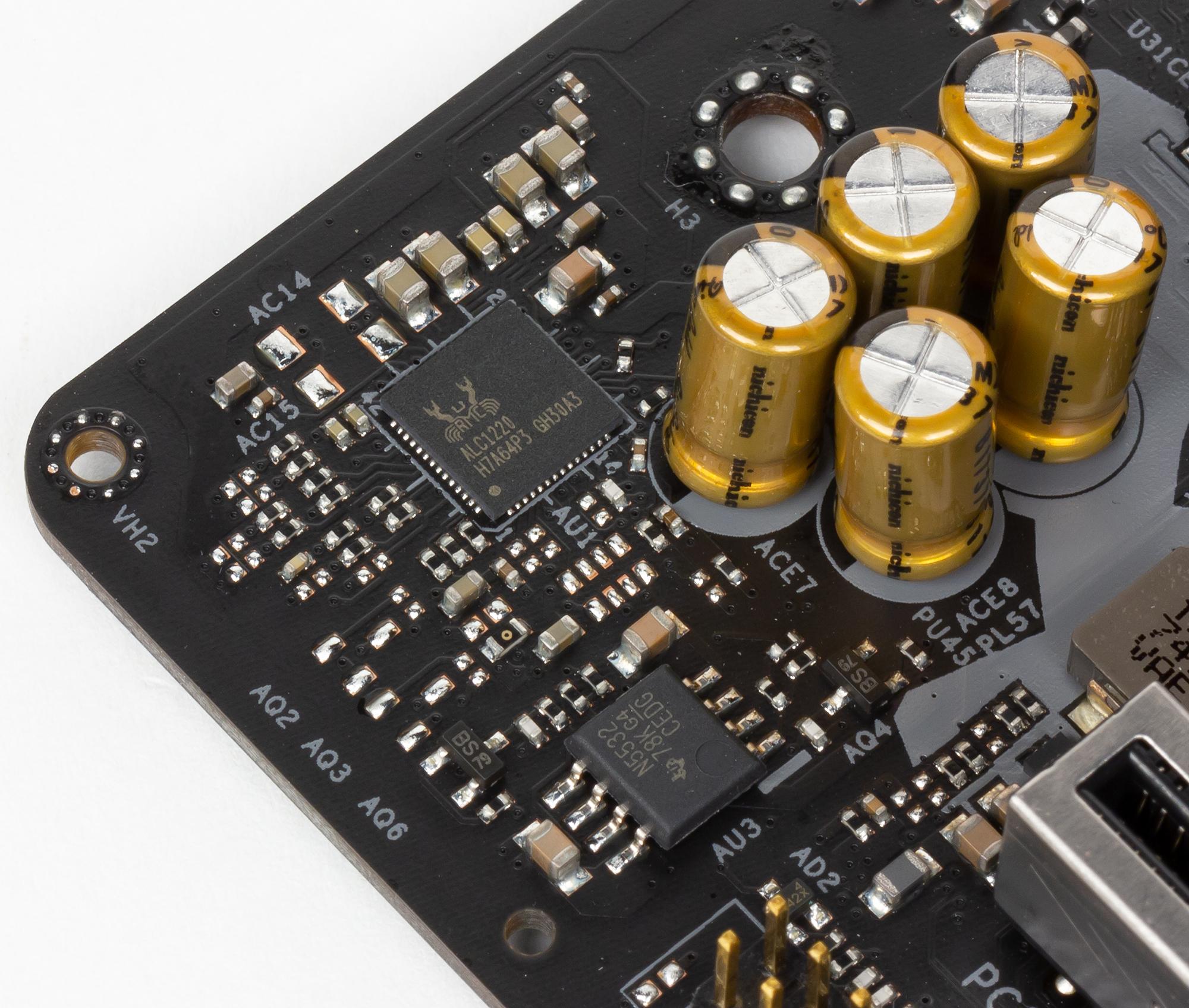 Аудиоподсистема платы (как и всех топовых современных моделей), основана на HDA-аудиокодеке Realtek ALC1220. Все элементы аудиотракта изолированы на уровне слоев PCB от прочих компонентов платы и выделены в отдельную зону. Помимо аудиокодека звуковая подсистема платы включает фильтрующие конденсаторы Nichicon, а также операционный усилитель Texas Instruments NE5532 Premium (пригодится для подключения наушников). В принципе, стандартный для современных топовых плат набор, обеспечивающий стандартное же звучание — что-то большее можно получить разве что использованием внешнего аудиоинтерфейса.
