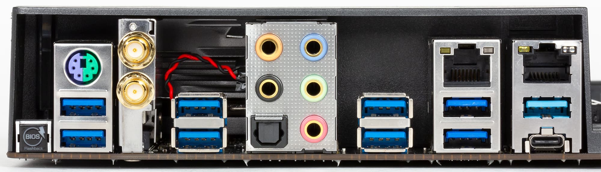 | Разъемы на задней панели | 2 × USB 3.1 (1 × Type-C) 8 × USB 3.0 1 × PS/2 2 × RJ-45 1 × S/PDIF (оптический, выход) 5 аудиоразъемов типа миниджек |